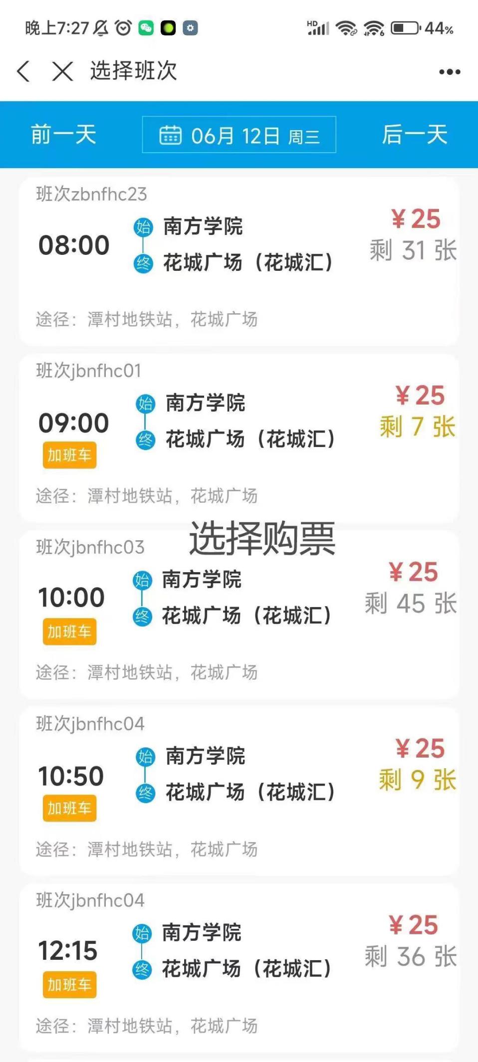 校园巴士可以到达从化地铁客运站(约30分钟)、花城广场(约70分钟)、广州南站(约90分钟)这些地点。通过选择目的地、时间就可以购票啦。