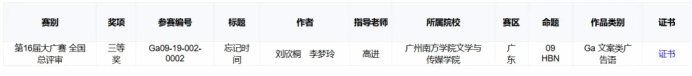 第十六届全国大学生广告艺术大赛全国总决赛结果于日前揭晓,122cc太阳集成游戏文传学院再创佳绩,斩获两枚全国三等奖、一枚全国优秀奖,从数量到成果创近年来国赛最佳成绩!其中,我院何小昱创作的广播类作品《酸甜可爱,烦恼不再》由新闻与传播系罗希老师指导,荣获全国三等奖,刘欣桐、李梦玲两位同学创作的文案类作品《忘记时间》由网络与新媒体系高进老师指导,同样获得全国三等奖;此外,张乐懿、于涵、冷凝三位同学携手创作的广播类作品《清热解毒大PK》由罗希老师指导也荣获全国优秀奖。这些荣誉不仅展现了122cc太阳集成游戏122cc太阳集成游戏在广告艺术领域的卓越实力,也代表了我校广播类、文案类的最高成绩!