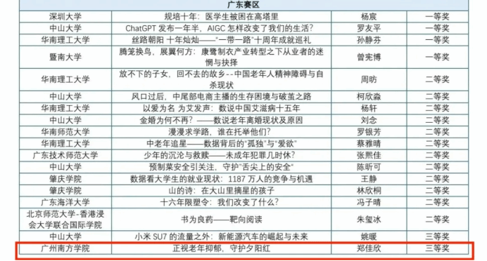 本届大赛更是规模空前,吸引了来自 380 余所高校、20余家媒体机构的2000 余支队伍、7500 余人报名参赛。参赛学校、队伍及人员数量均创历史新高,竞争的激烈程度可见一斑。经过专家们的严格评审,广东赛区最终产生一等奖4项、二等奖12项、三等奖17项、优秀奖17项。每一项荣誉的背后,都是参赛选手们的辛勤付出与卓越才华的展现。他们在这场激烈的角逐中,用数据讲述故事,用创新点亮未来,为新闻传播领域注入了新的活力。