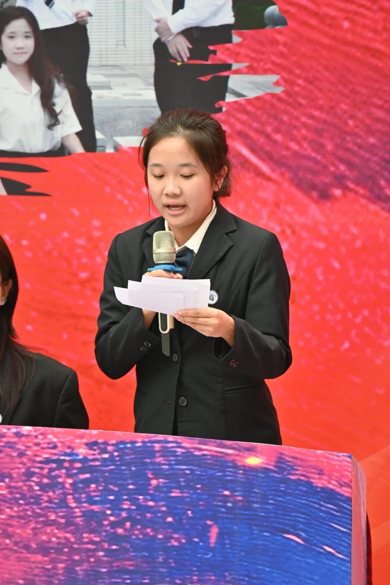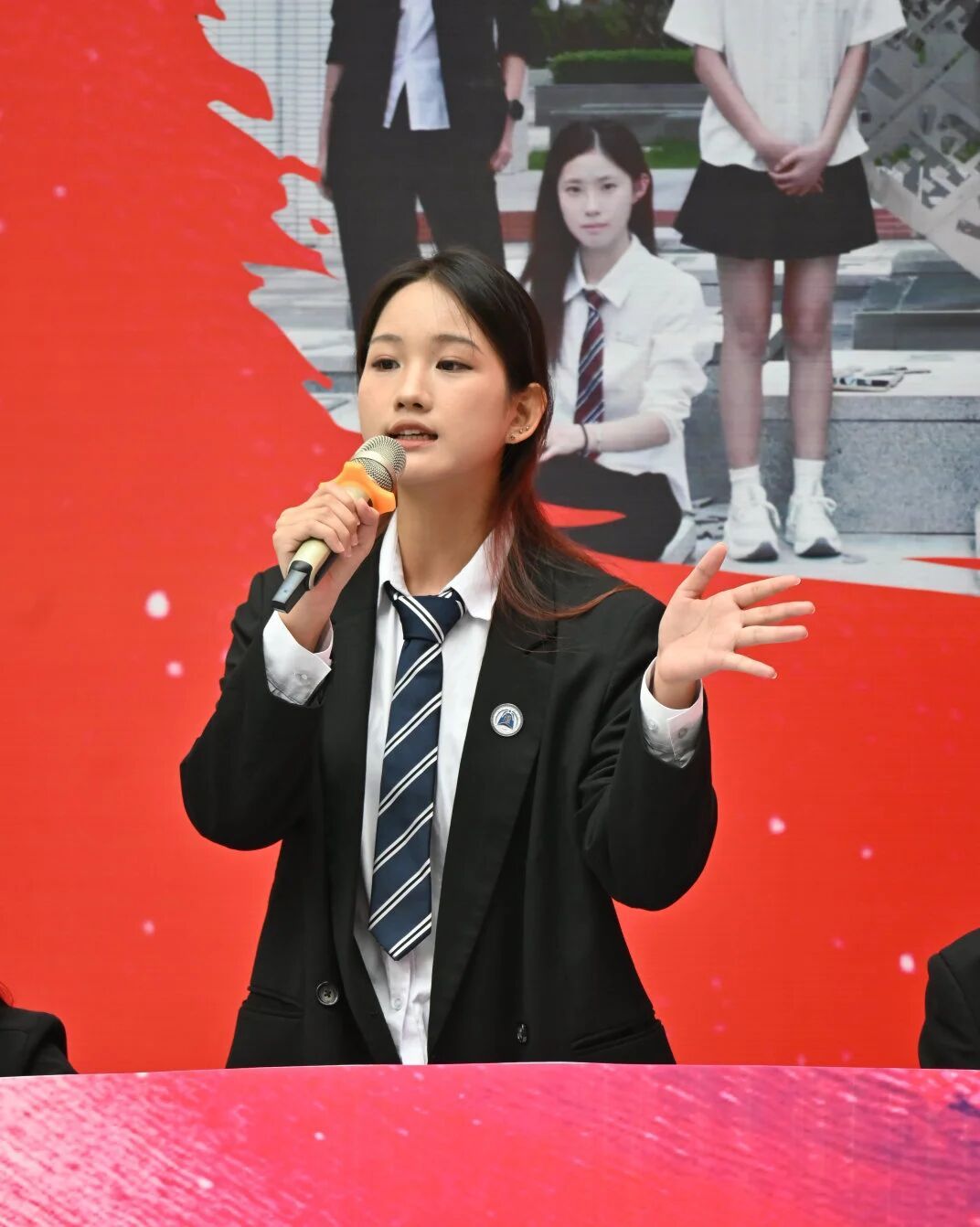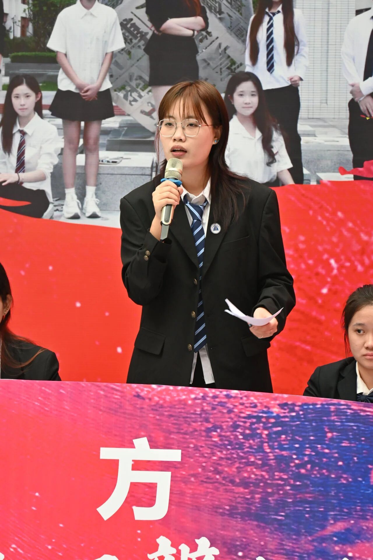 我方四辩在自由辩论中情绪饱满,妙语连珠,在保留法治辩论的严谨性基础上,又兼具语言感染力,更巧妙借助纸质图片素材现场举例论证,通过真实的金融反诈案例对比,生动展现出严肃宣传在普法过程中深入人心、切实提升大众防范意识的积极作用,让观点更具说服力。
