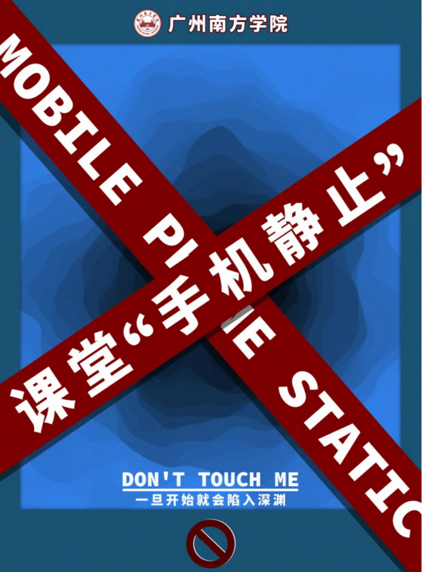 海报以蓝色为主色调,寓意课堂的学习可以带领同学们在知识的海洋里遨游。色块的组成呈现出手机的样子,呼应主题中的“手机”,而用两条红色的禁止带封住了手机,红色选取的为校徽的经典颜色,寓意在全校范围内营造良好自觉的学习氛围。上面的文字为“课堂‘手机静止’”是强调本次主题,下面的文字为“Mobile Phone Static”,意为手机干扰,旨在希望同学们意识到手机会干扰到课堂学习。被封住的手机屏幕中央设计成深渊,仿佛一层层地陷入无底洞中,泛指当下许多人在手机中迷失自我、忘却时间的现象,也就是手机屏幕底部的那句话——“一旦开始就会陷入深渊”。在手机屏幕的下方为禁止符号,与屏幕底部的文字“Don’t touch me”相辅相成,希望同学们不要在课堂期间触碰手机。