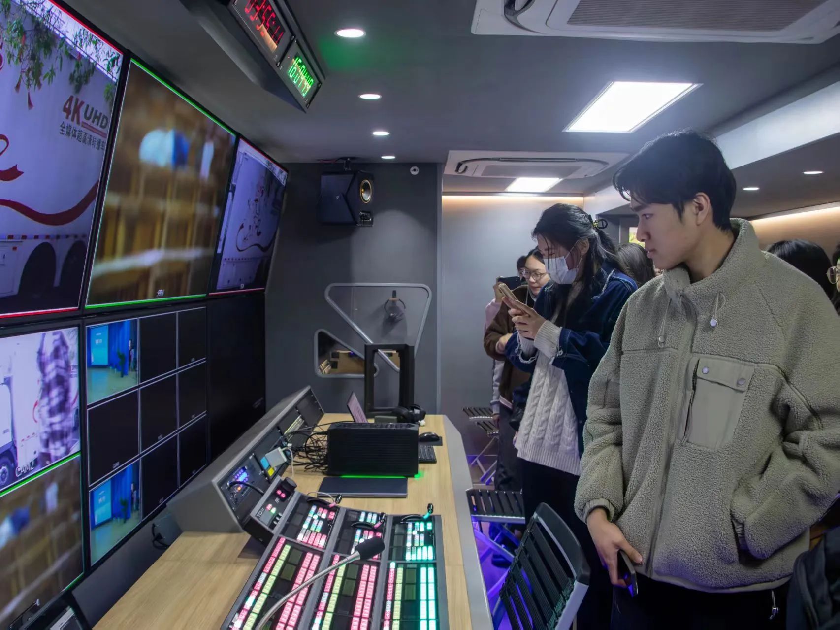 交流会前,徐宏董事长亲自带领同学们参观公司的全媒体超高清转播车,并着重介绍了转播车的先进设备与功能。他向同学们介绍了转播车的运作流程和技术细节,让同学们对转播车的运作有了直观认识。在徐宏董事长的指导下,同学们亲自上车操作设备,体验转播工作的实际操作流程。