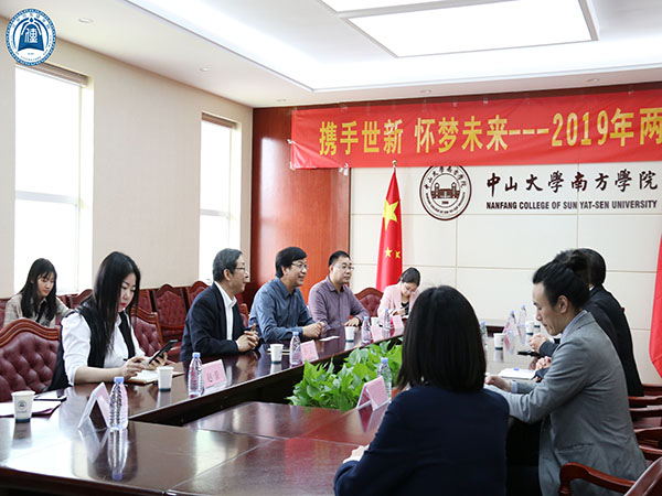 宣讲会结束后,各位嘉宾老师移步到A1行政楼第一会议室举行2019年我校与台湾世新大学合作座谈会。台湾世新大学游梓翔副校长、两岸事务处王正平处长、两岸事务处曾崎泓老师应邀参加座谈会。我校黄南松校长助理、继续教育学院院长兼国际合作与交流部副部长代燕飞、张晓虹老师,我院院长孙立教授、赵景老师、张晓丹老师出席了此次座谈会。