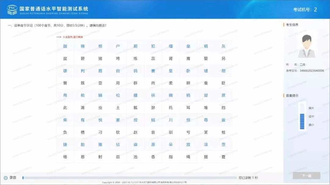 试音开始后,用适中的音量朗读屏幕中显示的文字。