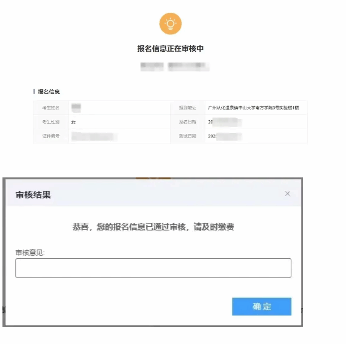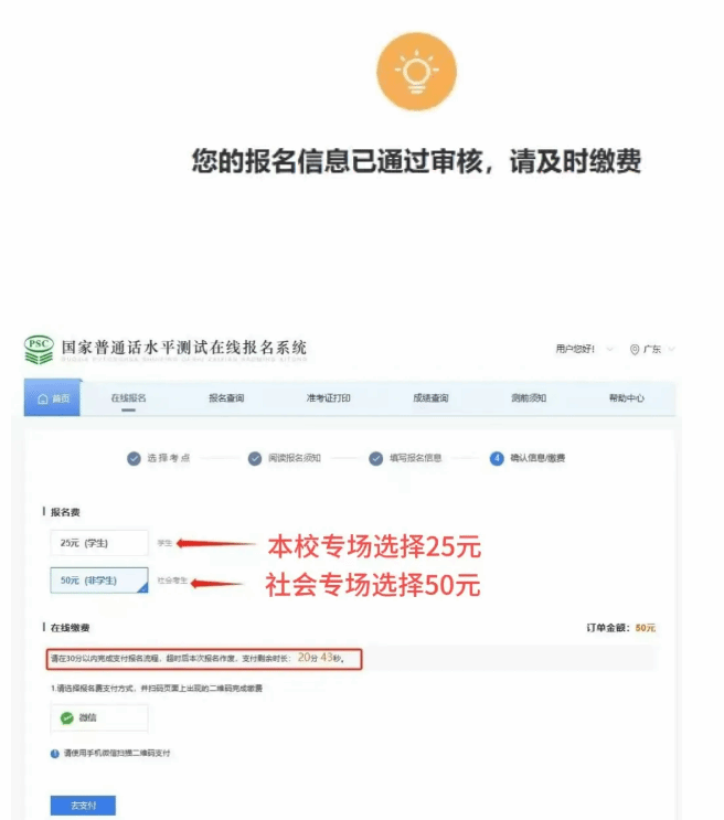 (5)身份为学生的考生须按照系统规定上传学生证明,我站将在24小时完成信息审核,请及时关注审核结果,审核通过后请在规定时间内缴费,若未通过审核,请按照审核结果进行修改提交;社会人员不需要信息审核,信息核对完成后在规定时间内完成缴费(50元)即可。