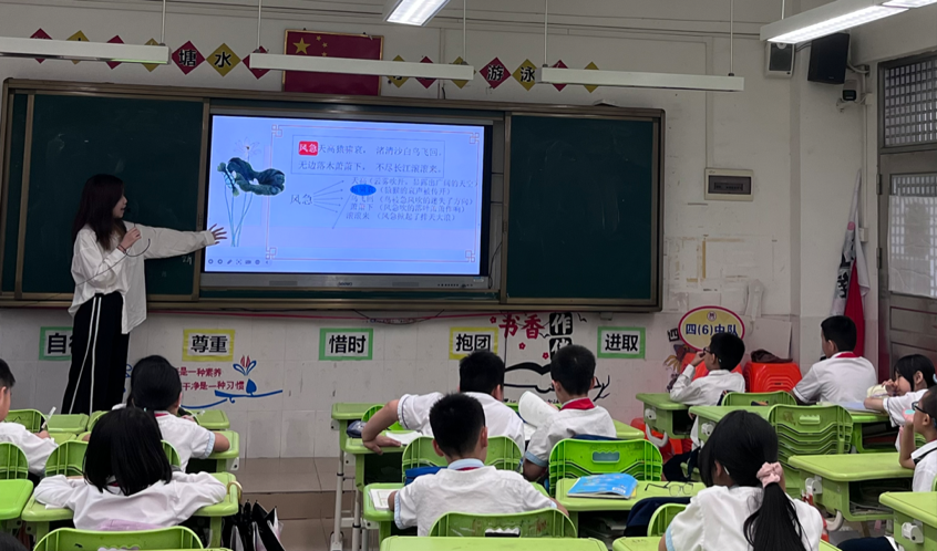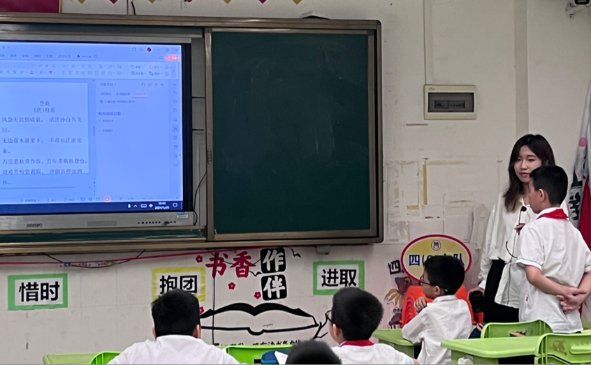 春风化雨,诗意传承。5月20日下午,122cc太阳集成游戏语言文字服务团队的同学们在指导教师石巧如的带领下,来到从化区流溪小学,为同学们带来了一节精彩纷呈的诗词课堂。本次的小老师是来自2022级达人中文班的朱颖同学,让我们在小朱老师的带领下,一同走进杜甫的诗词世界,感受他的家国情怀与壮志凌云吧。