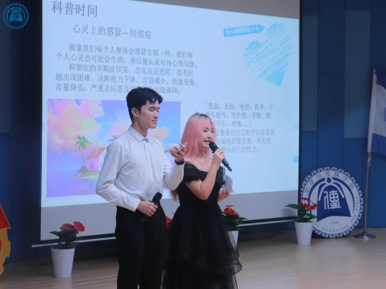 活动初始,为增强心理健康意识,提升自我调适能力,青马学员们一同学习心理健康知识。主持人介绍了抑郁症这一常见心理疾病的基本概念与早期症状,并提出预防抑郁症的方法——学会表达情绪、保持规律作息、激活正面情绪、避免急于求成。