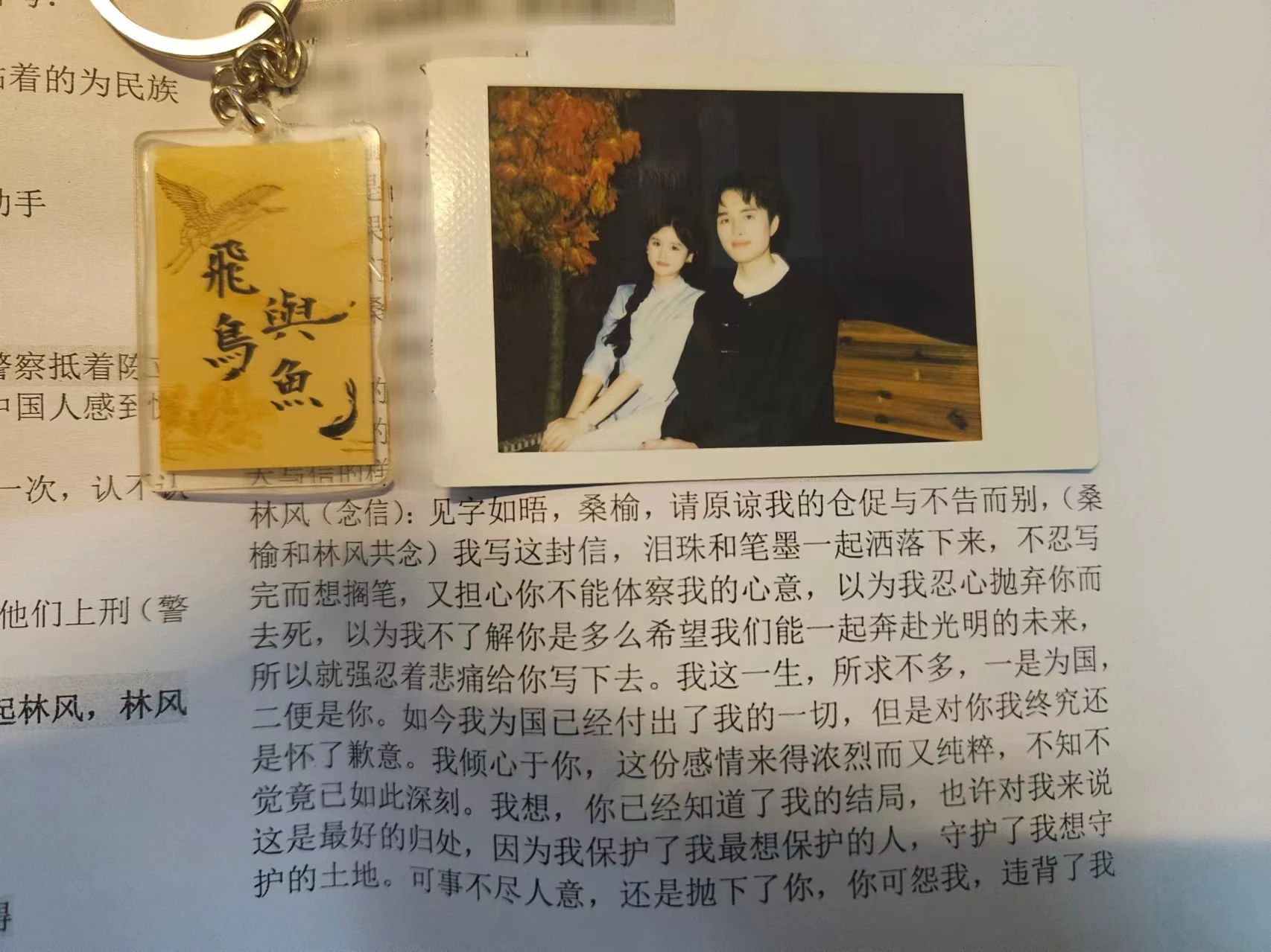 原创话剧《飞鸟与鱼》取材自《与妻书》,主角的历史原型是林觉民、陈意映。该话剧讲述了发生在民国二十四年时局动荡、内忧外患的华北,五个风华正茂的青年齐聚大学话剧社来排练爱国话剧。国难当头,他们用各自的方式表达了自己的爱国热血、唤醒了众多青年的爱国正气。
