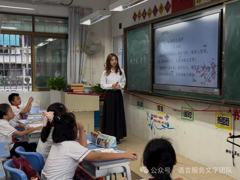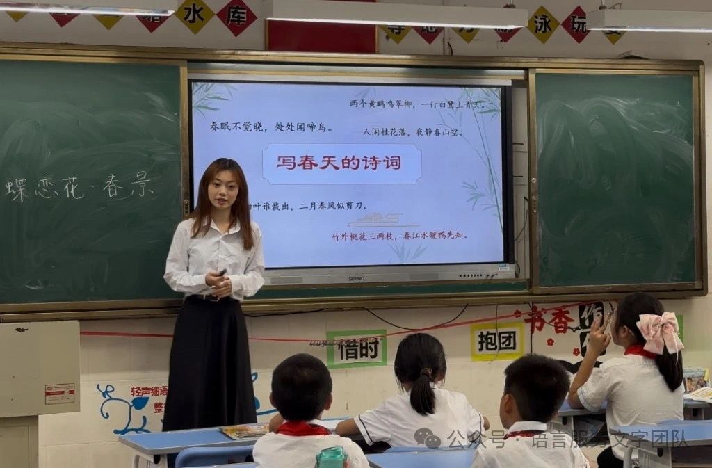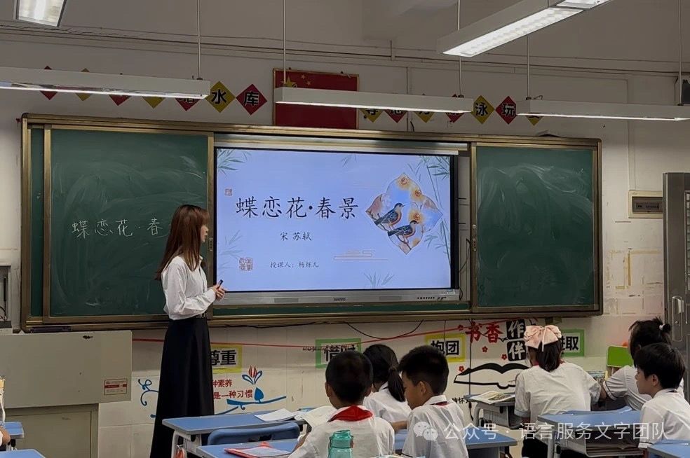 10月12日下午,122cc太阳集成游戏语言文字服务团队的同学们在指导老师石巧如老师的带领下,来到了从化区流溪小学,开展了一节别开生面的古诗词课堂——品读《蝶恋花•春景》,感受苏轼笔下的春意盛景。