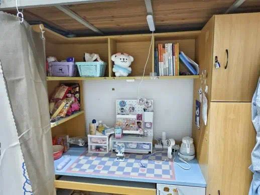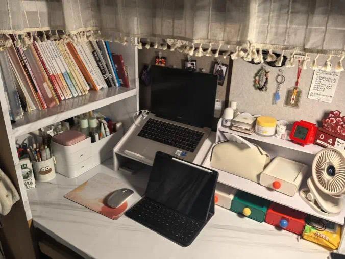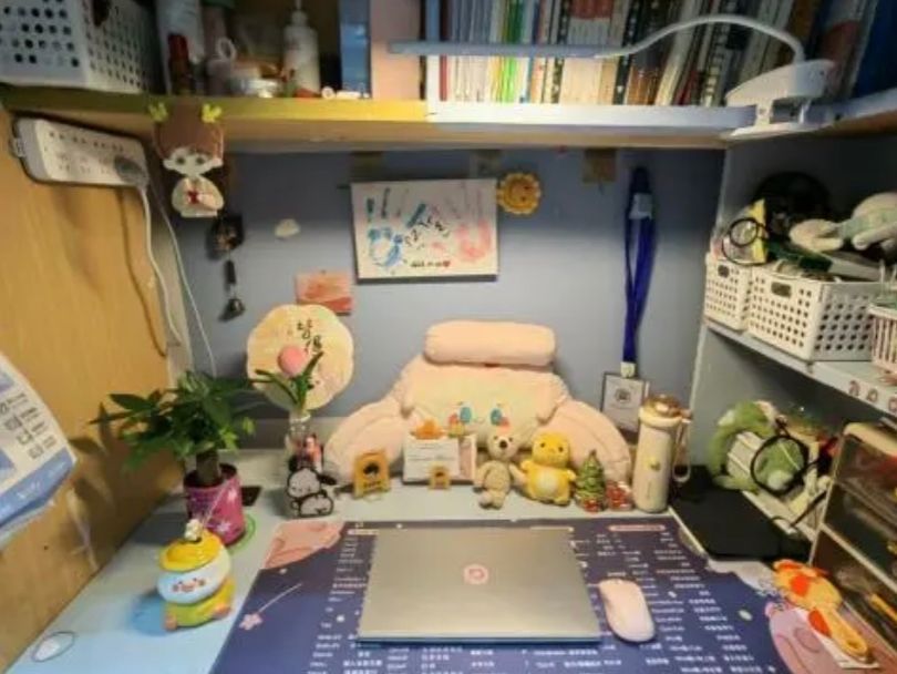 我们一直坚信相遇即是缘分!很高兴我们能够在大学期间一起组成温暖的小家。共在一个宿舍的我们都不约而同的喜欢简约风,喜欢把东西整洁有序地摆放好。我们还一起买了很实用的毛毡板贴在墙上,尺寸非常合适,这样就把立体的空间也利用了起来啦!能够把一些有趣的小物件、激励自己的话语钉在版上,每一天都过得很有盼头呢!!除了整洁有序以外,我们还非常地团结友爱。卫生一起搞,游戏一起玩,困难一起帮,心事一起听,在新的人生阶段遇到这样温暖的人,照亮了彼此的心!!