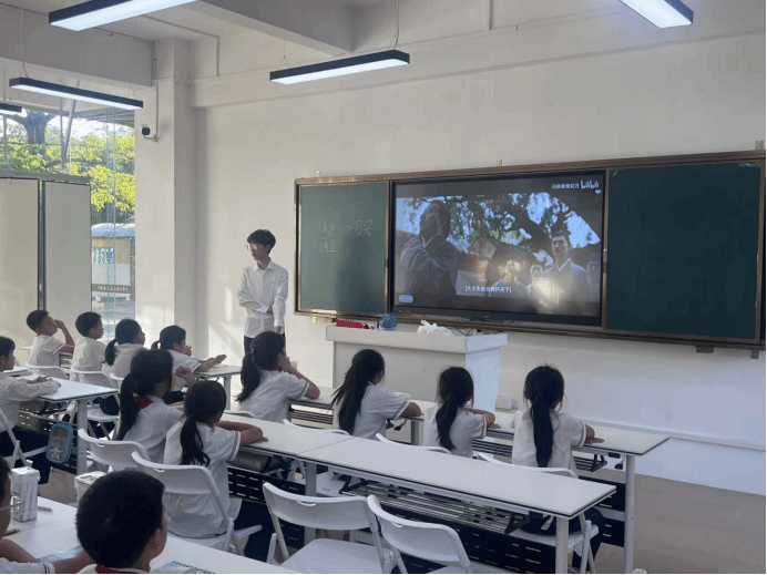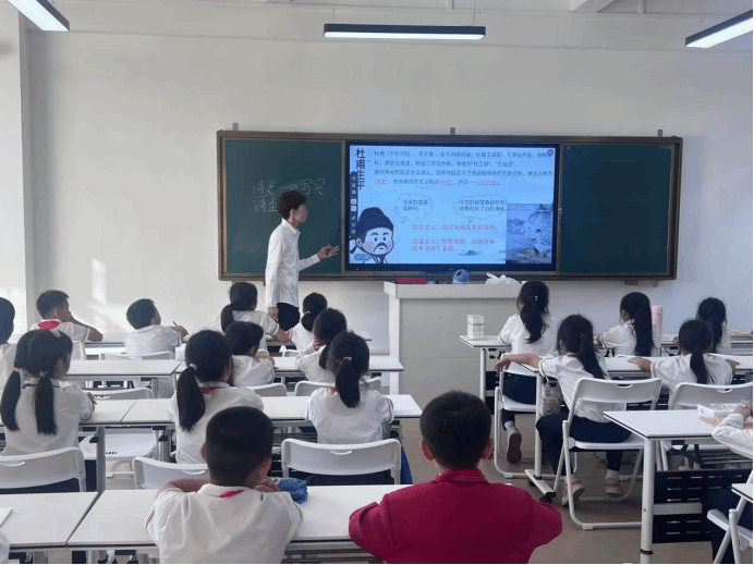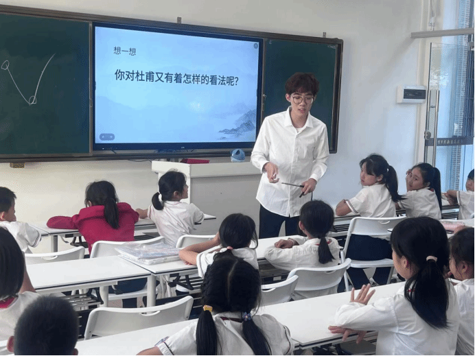 课堂伊始,小廖老师先是通过猜谜的方式,引导小朋友们猜猜今天上课要学习的是哪个诗人。同学们很快就猜出是诗人杜甫,由此点燃了同学们上课的热情。