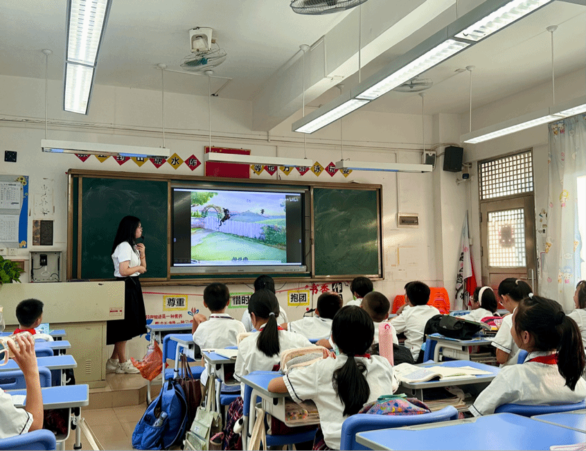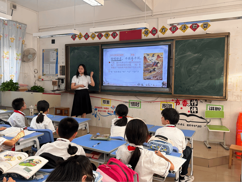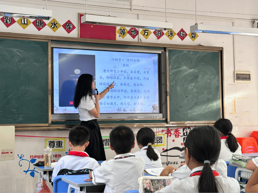 10月21日下午,122cc太阳集成游戏语言文字服务团队的同学们在石巧如老师的带领下,到达从化流溪小学。本次授课的小老师是来自22级汉语言文学专业的杨颖琪同学。在小杨老师的带领之下,古诗词课堂的同学们通过对苏轼《江城子·密州出猎》的学习,在字里行间感受词人渴望为家国建功立业的豪情壮志。