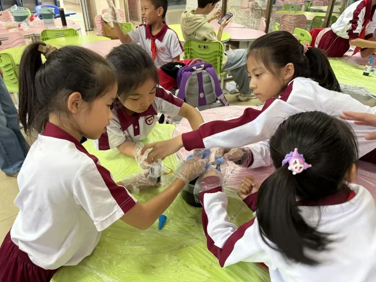 接着小杨老师便开始向同学们介绍起扎染的过程、扎结的技法以及注意要点并播放了制作扎染的视频。同学们都聚精会神地认真听讲着,为接下来的动手实践做好准备。与此同时,此次同行的小助手们帮忙向同学们分发已经浸湿完毕的白布、皮筋、染色剂和手套等等扎染所需的物品。