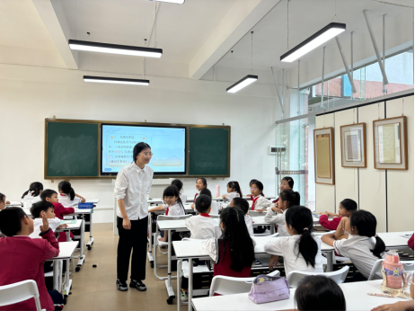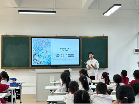 课堂开始之前,小欧老师通过提问抢答的方式,带同学们复习之前学过的《绝句二首(其一)》,在同学们异口同声之下,小欧老师带着同学们背诵全诗,就此引出本节课需要学习的课程——《绝句二首(其二)》。