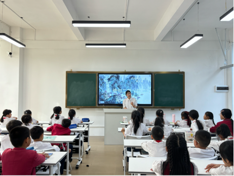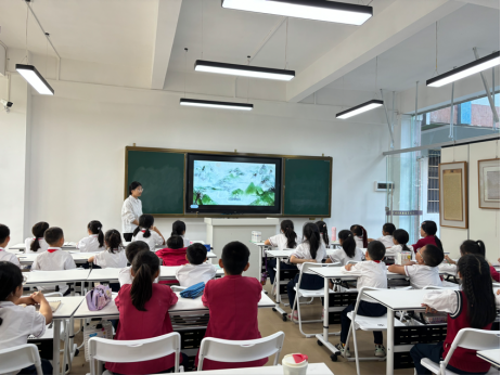 在诗歌鉴赏环节,小欧老师用“诗中有画”四个字带同学们走入杜甫笔下的春天。小欧老师先是抛出了诗中有什么颜色这个问题让同学们思考,接着,又提出了“江碧鸟逾白,山青花欲燃。”这句诗运用了什么手法。同学们的小手如雨后春笋般高高举起,全身心投入在课堂里。紧接着,欧老师给了两张对比图片,让同学们真正体会“山青花欲燃”的景色。在小欧老师的带领下,同学们看到了一幅生机勃勃的春图。最后,小欧老师带领大家复习了其他几句诗中有颜色的诗词,在朗朗读书声中,五彩缤纷的世界展示出来。