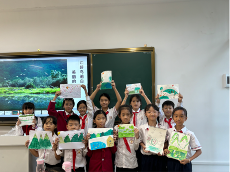 最后到了画画环节,同学们发挥大胆的想象,描绘着自己心中的“江碧鸟逾白,山青花欲燃。”,绿意盎然的春在杜甫笔下,更在每位同学的心中。