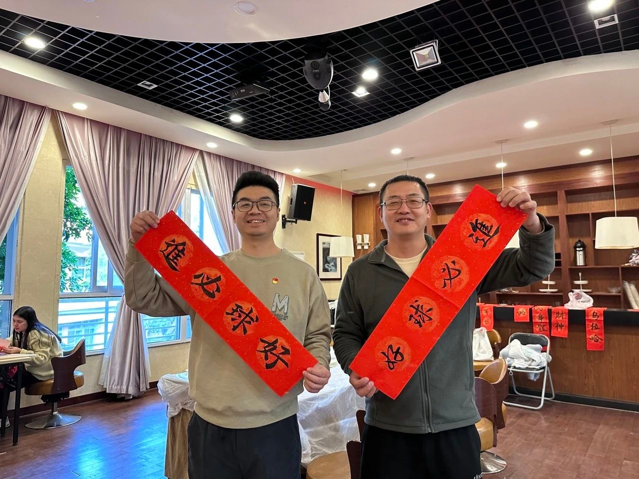 红底黑字的“福”字代表着一切顺利、幸运,寄托着大家对美好未来的祝愿。一点一捺都是对过去一年的总结,对即将到来的新年的期盼。同志们挥毫泼墨、笔走龙蛇、热情创作,将美好的祝福化作一幅幅寓意吉祥的春联。创作现场氛围浓厚,大家个个笑容灿烂、激情满怀。