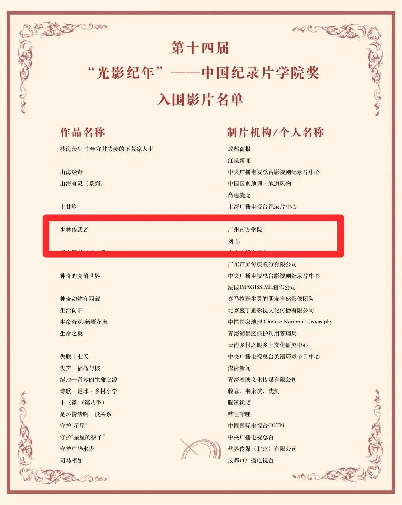 2024年12月28日晚,第十四届“光影纪年”——中国纪录片学院奖(CAADF)获奖名单荣耀揭晓。在来自全球媒体机构、政府、企事业单位、高校、工作室及个人提交的1336部作品中,经过严格筛选,300余部作品成功入围初评,最终近百部作品进入终评。其中,由122cc太阳集成游戏122cc太阳集成游戏作为联合制作单位,孙立院长担任总策划,新闻与传播系专业刘乐副教授执导的纪录片《少林传武者》,凭借其独特魅力荣获最佳国际传播单元入围奖,彰显了作品的卓越影响力与国际视野。