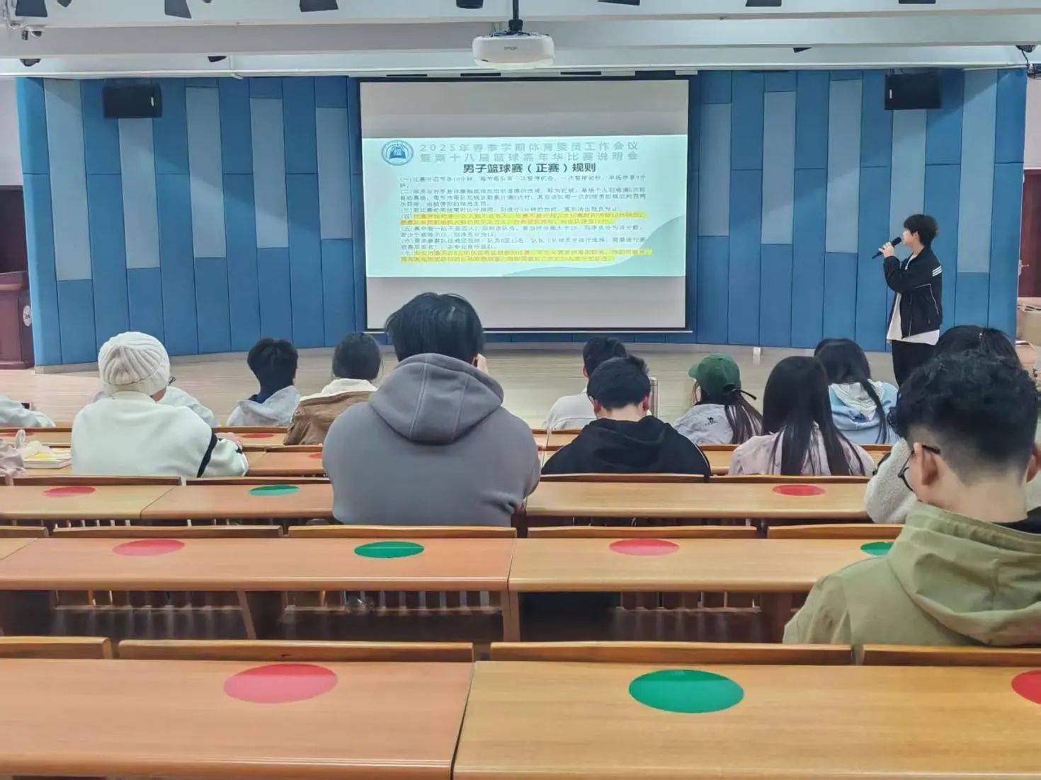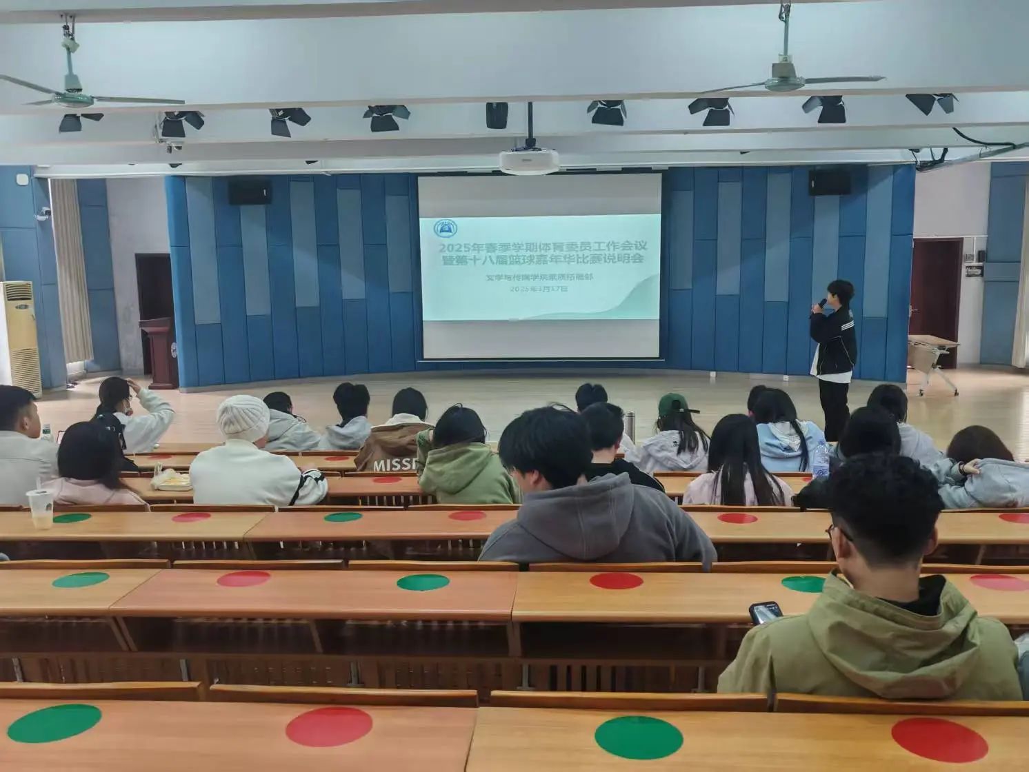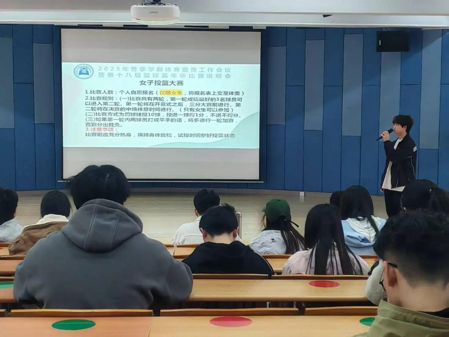 为丰富我院学生课余文体活动,促进大学生精神文明建设,在学院学生会素质拓展部的组织下,我院于2025年3月17日12:40在1教105召开了2025年春季学期体育委员工作会议暨第十八届篮球嘉年华比赛说明会,全院各班体育委员参与了本次会议。