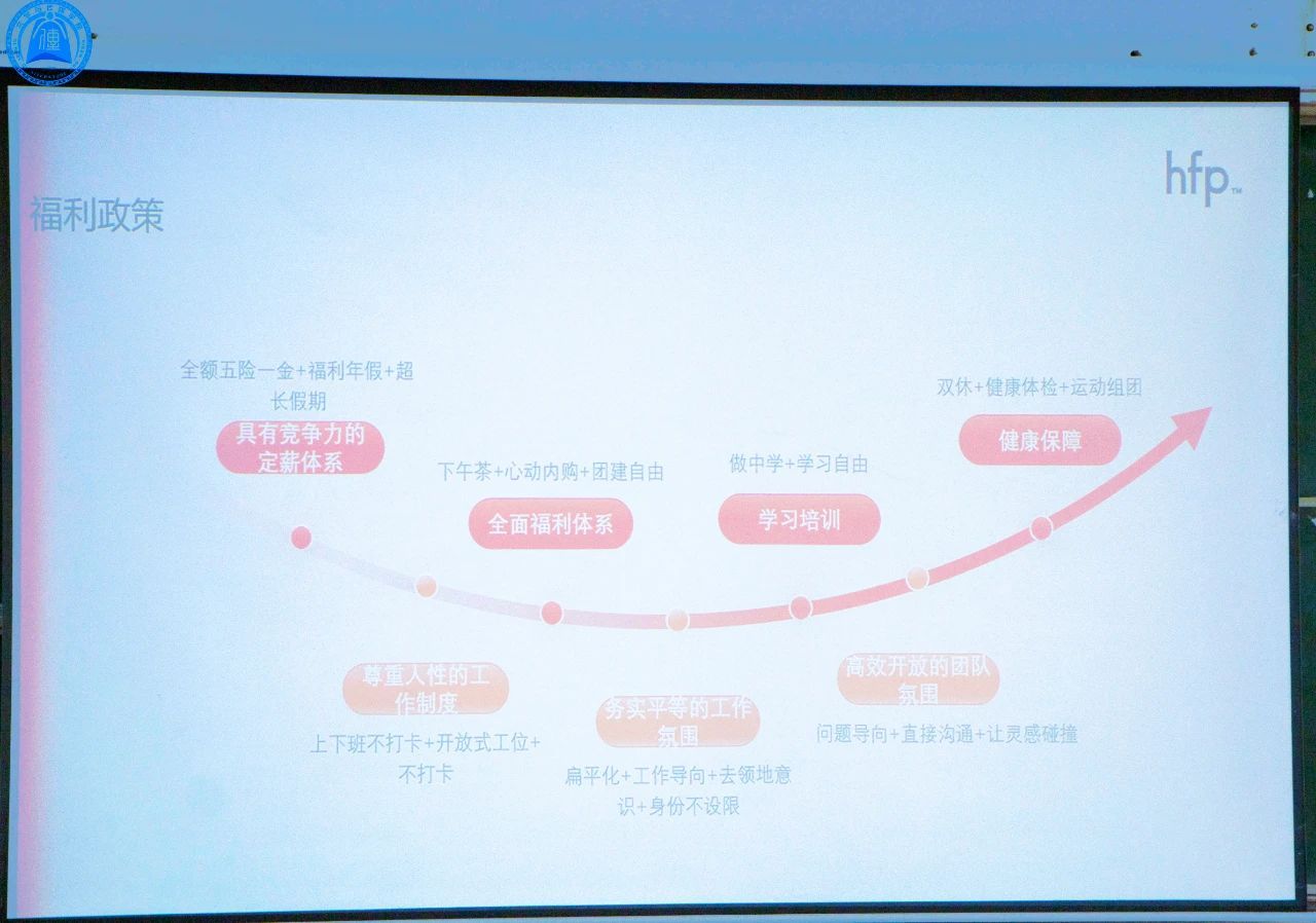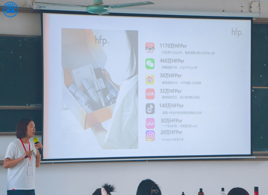 宣讲会伊始,黄小萍女士为同学们生动讲解了HFP国货护肤品牌的崛起之路。她通过展示品牌在电商平台的销售成绩以及联合互联网社交平台的创意宣发案例,直观地呈现了HFP品牌的影响力。同时,她还介绍了品牌自建研发实验室、透明化成分、国家级检测认证等,充分展现了品牌的研发实力。