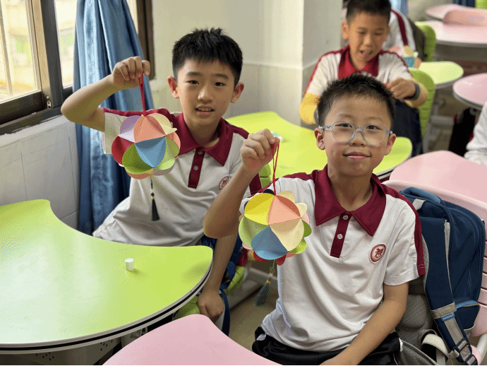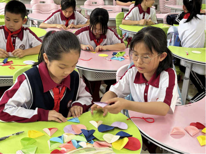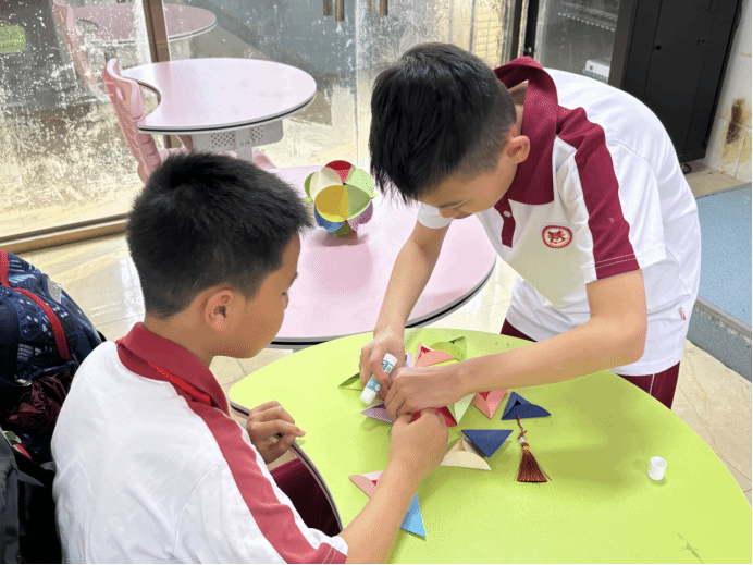 接着,小李老师播放了视频,向小朋友们展示了绣球的制作过程。一折找圆心,二折成三角,胶棒涂抹站粘起来。重复这些步骤就可以得到一个手工绣球啦!与此同时,本次课堂的小助手们为小朋友们分发制作材料,20张圆形卡片,1条红绳,1个中国结挂饰。拿到材料的小朋友们迫不及待地开始了制作。
