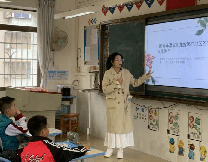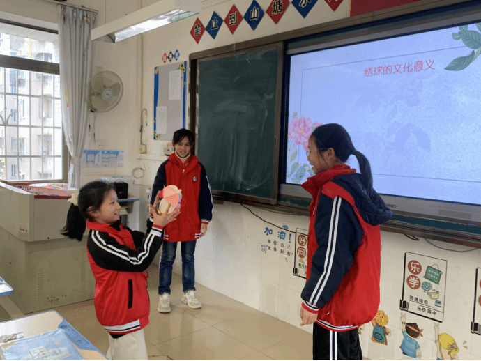 随后,小李老师从这些小问题迅速过渡到今天的主题广西非遗绣球。小李老师播放一个小视频,大致地为同学们介绍了什么是绣球。当同学们对绣球充满兴趣之时,小李老师紧接着详细讲解了绣球的历史起源、文化意义、制作工艺、种类特点以及传承与创新。