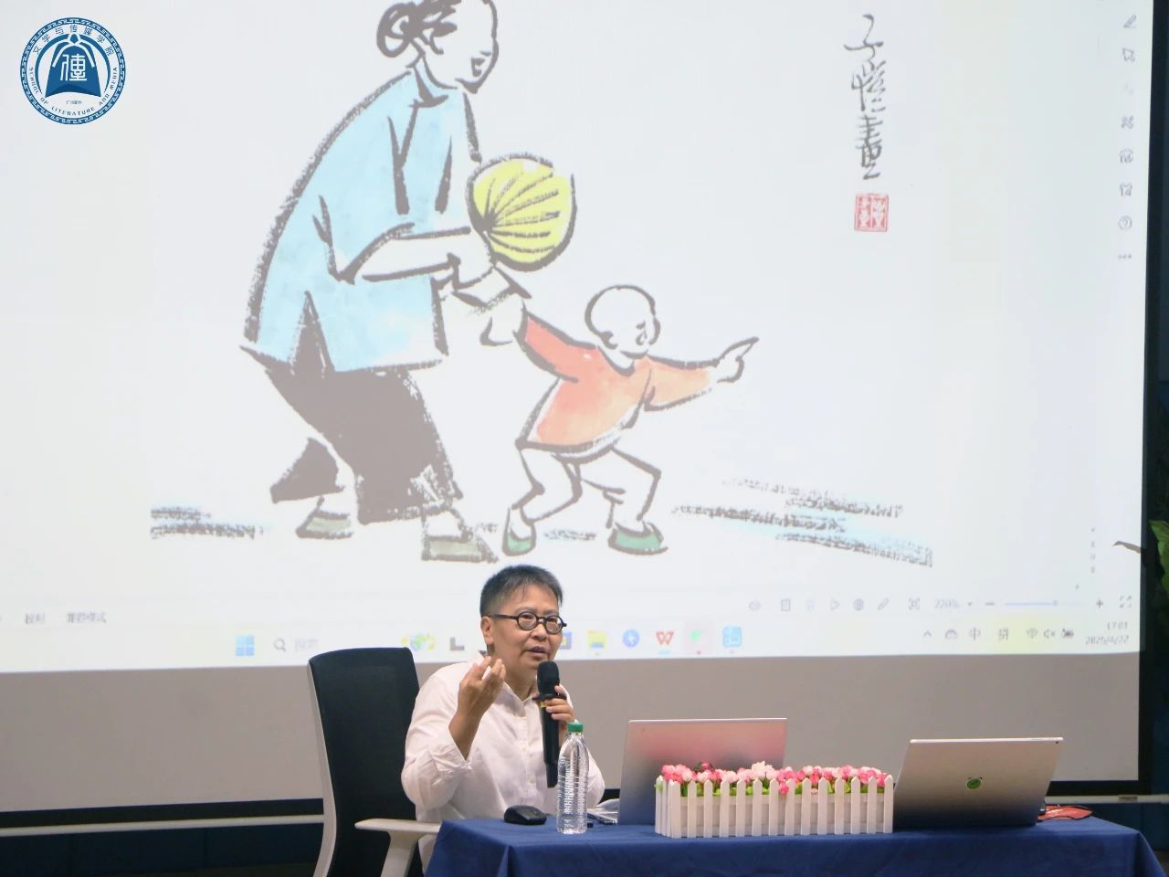 讲座临近尾声,孙院长发表感言。他提到,通过此次讲座,对丰子恺先生有了更感性的认知。孙院长回忆,多年前文传学院文学杂志《文荃》设计封面时,有学生从丰子恺画作中汲取创作灵感,虽作品有不足,却也彰显了丰子恺画作的影响力。孙院长高度评价胡教授对丰子恺画作美学内涵的剖析,尤其是人体感官在审美中的作用,令人耳目一新。同时,他对胡教授绘画作品高度赞扬,认为其作品充满拙趣和萌趣,有独特的魅力。