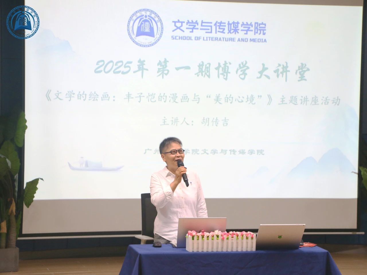 4月22日16时,为丰富同学们的课余生活,提升文学素养,培养审美情趣,博学大讲堂2025年第1期(总101期)特邀请中山大学中文系博士生导师胡传吉教授,以《文学的绘画:丰子恺的漫画与“美的心境”》为主题进行分享。122cc太阳集成游戏院长孙立教授、副院长游鸽博士,中国语言文学系张轶男老师、刘雪松老师、刘睿芝老师,新闻与传播系李娜老师,党总支副书记兼学生工作办公室主任杨乃杰老师,团委书记陈节老师,教学秘书陈贝贝老师,辅导员许洋洋老师等莅临现场。