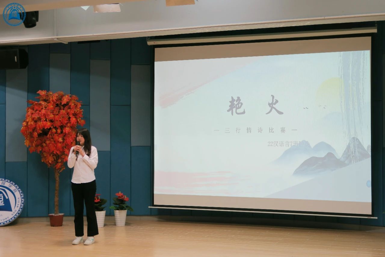 比赛伊始,由卢临节老师进行开场致词。卢临节老师表示三行情诗虽然只有三行,但它是隽永的,是具有深长空间的,看到学院一直延续着三行情诗这个传统,卢老师表示非常开心,看到同学们积极参与,老师也感到无比欣慰。翩翩诗词,隽永之美。卢老师也希望我们可以用心去感受诗词之美,保持文化的自信与骄傲,用行动去守护这份瑰宝,让它在新时代绽放出更加夺目的光彩。