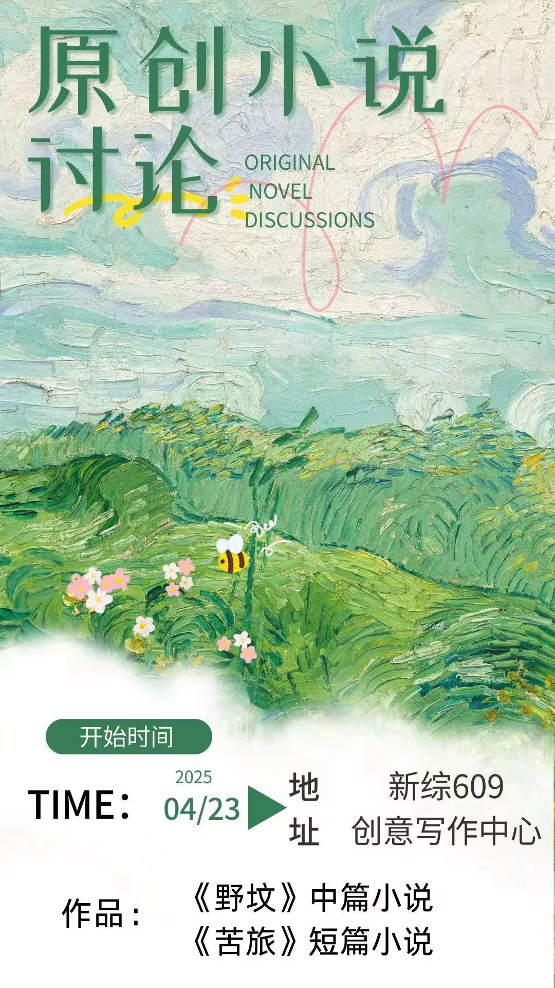 2025年4月23日,又是世界读书日,在这致敬文字力量、唤醒阅读热情的特别日子,我们在新综合楼609创意写作中心,顺利举办了第一期学生原创作品讨论会。本次讨论会由翔翼文学社指导老师刘涵玉老师主持,创意写作中心苟志和老师、杨南岳老师出席。参与本次改稿会的同学有:冯子殷,罗茜,陈妍熹,苏莉雅,麦奕瑶,邓智源,钟沂霖,陈晓琳,陈东阁。本次讨论的作品分别为中篇小说《野坟》(32068字)、短篇小说《苦旅》(7361字),作者均为汉语言文学专业的大二学生。
