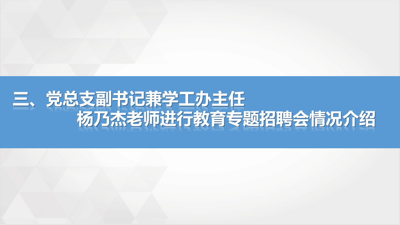 党总支副书记兼学工办主任杨乃杰老师主要从教育专题招聘会的招聘岗位情况、需求情况等方面进行了详尽的讲解。本次教育专题招聘会汇聚196家优质用人单位,提供1324个招聘岗位,需求人数达8997人,涵盖教育领域及多行业岗位,为2025届毕业生及2026届实习生搭建高效就业对接平台。在求职过程中,杨乃杰老师鼓励同学们要有信心,积极沟通、广泛尝试,有困难及时寻求学院、家人、朋友、辅导员老师的帮助,用好身边的各种资源。