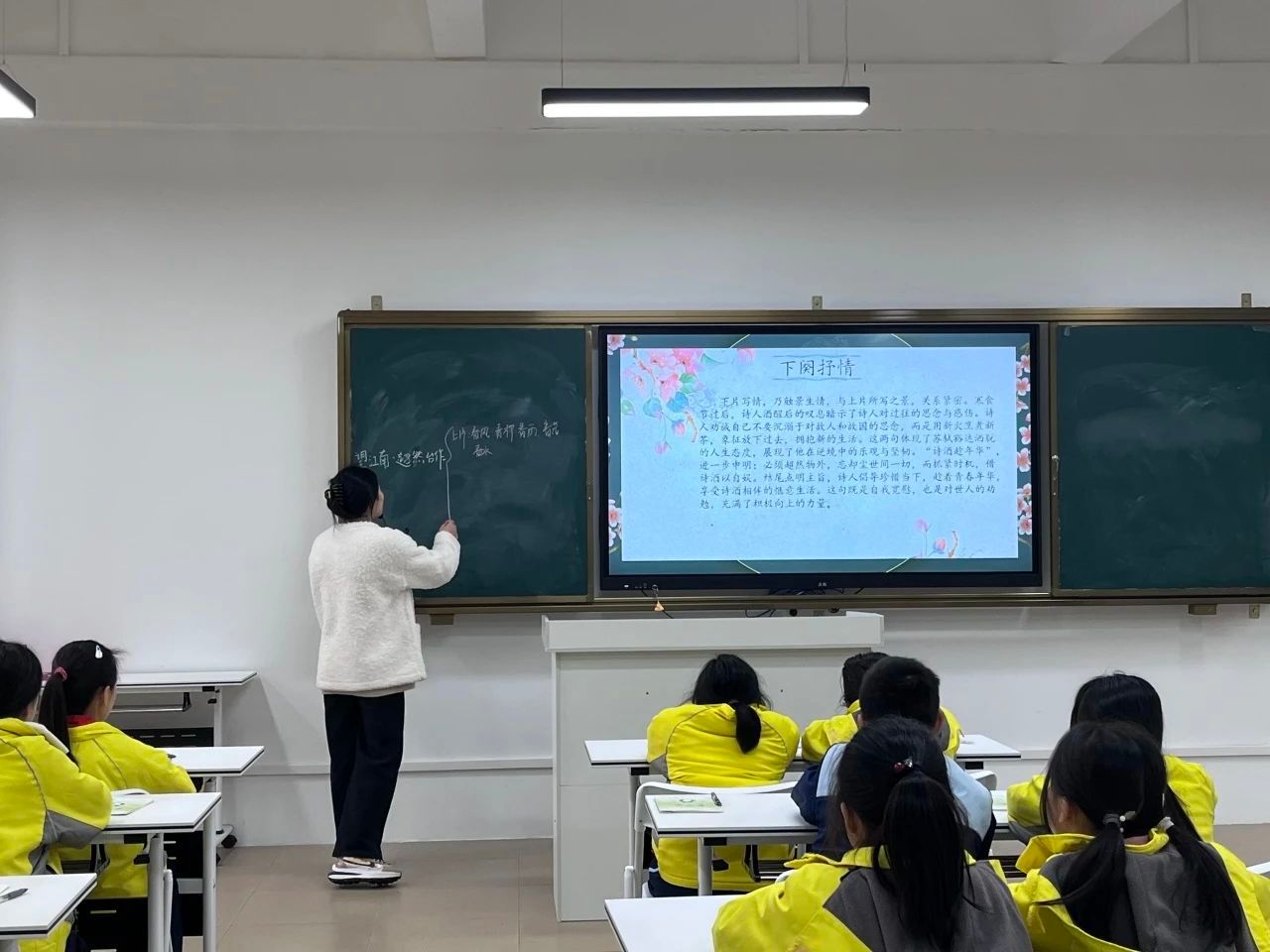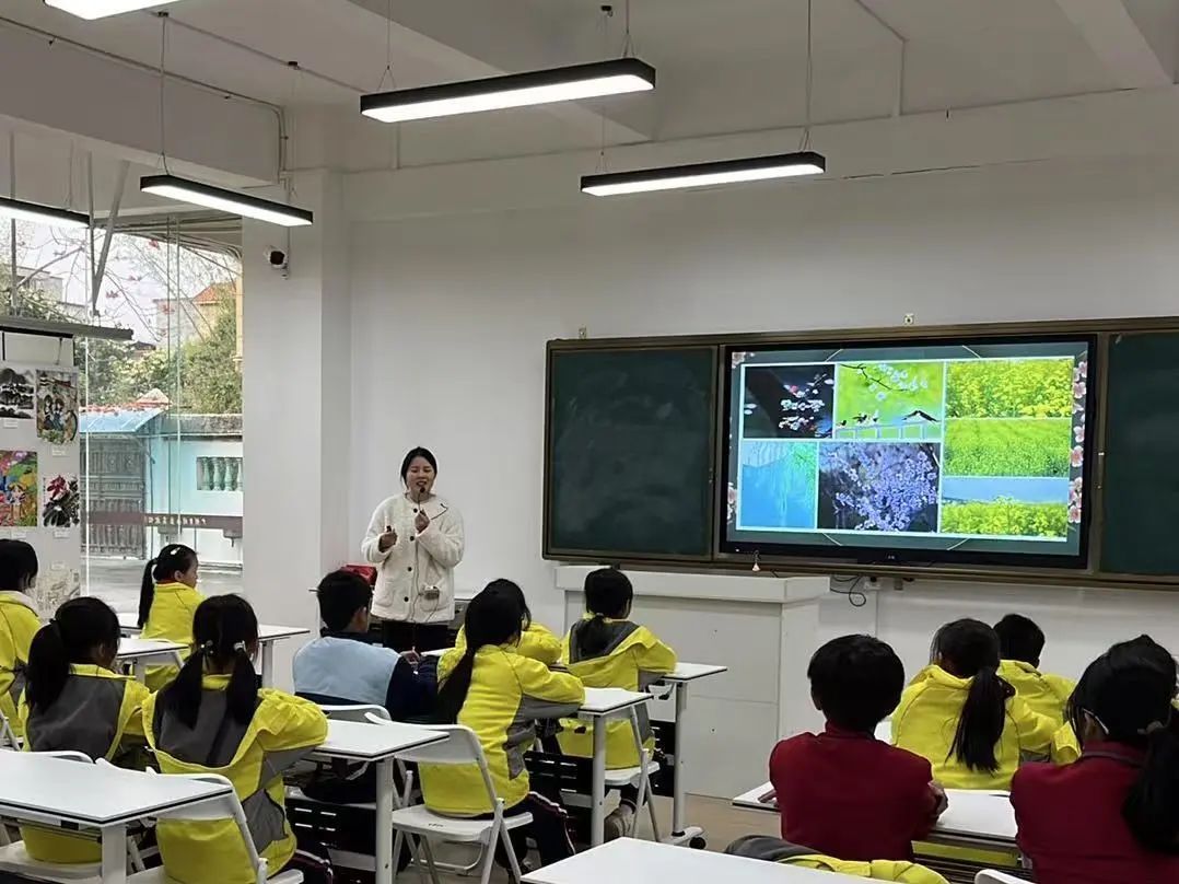 随后,进入诗词赏析环节,小梁老师引导同学们逐字逐句地赏析诗词。这首词从“春未老”说起,开篇点明时节。春天还未过去,微风轻拂,柳枝斜垂。诗人登上超然台,远望四周,只见半壕春水潺潺流淌,满城花开,绚烂夺目。烟雨朦胧中,千家万户若隐若现,为画面增添了一丝朦胧与深沉。理解完上阕词意,小梁老师引导同学们找出隐藏在其中的意象,如春风、春柳、春水、春花、春雨等等。通过这些意象,小梁带领同学们领略到了暮春时节景色的明艳美和朦胧美,并通过色彩的对比积极引导同学们理解词人内心的情感变化。