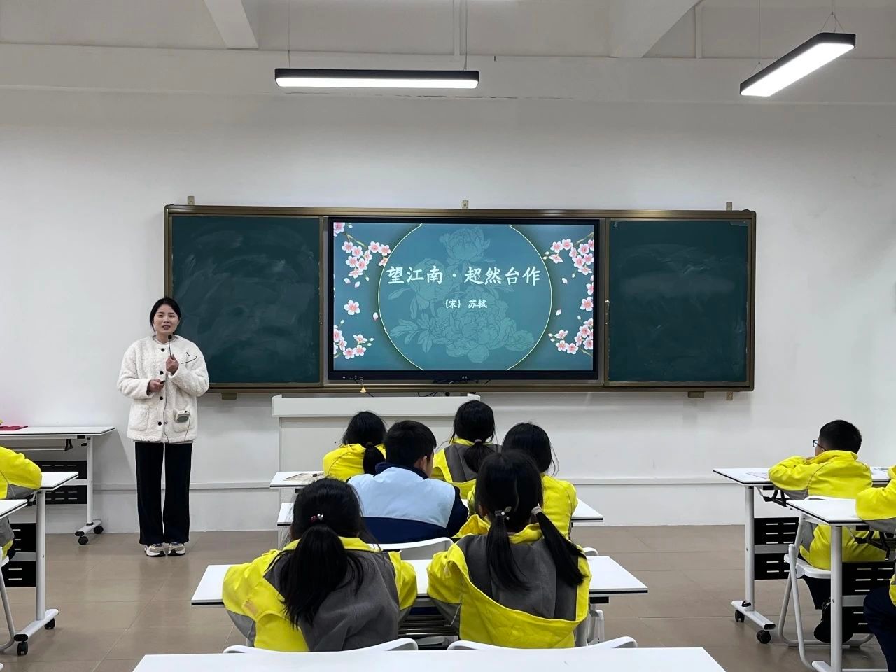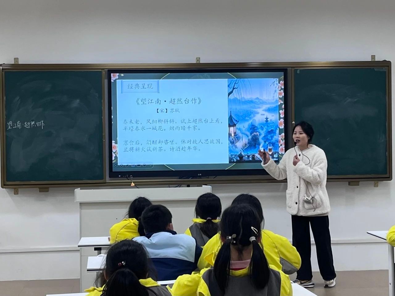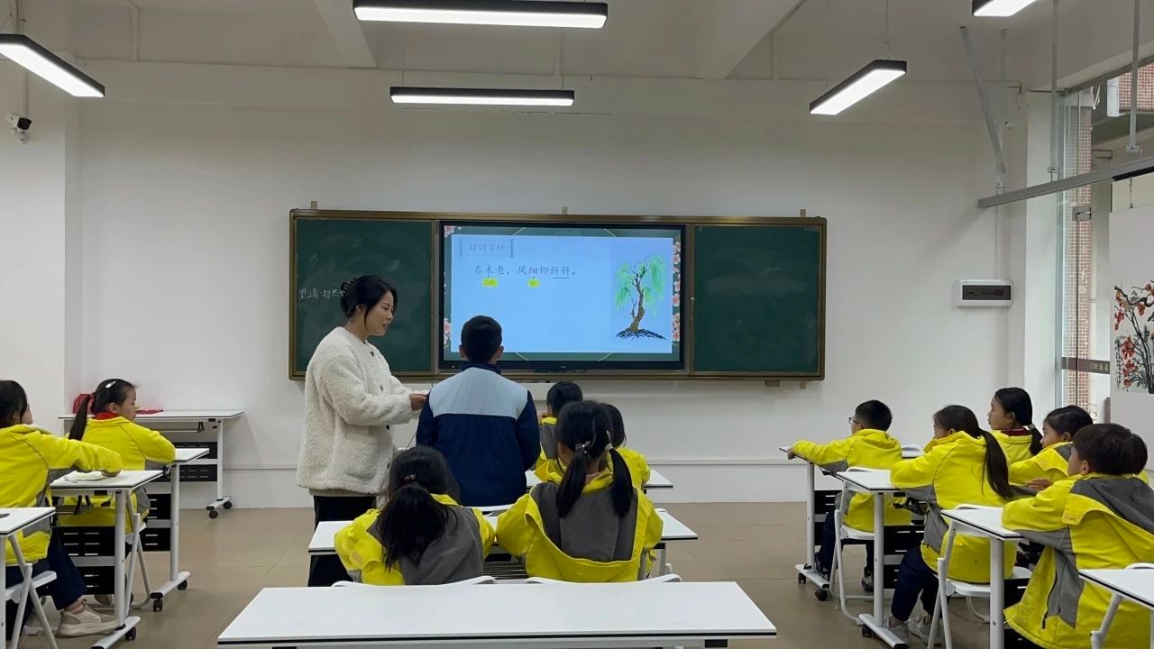 接着,小梁老师带领同学们进入诗词导读环节。小梁老师先播放了一个《望江南•超然台作》的诵读视频让同学们在视觉和听觉上更深入地领略诗歌的魅力。紧接着小梁老师带领着同学们认识了生僻字,在认读完字音之后,小梁老师积极引导同学们有感情地朗读古诗词。
