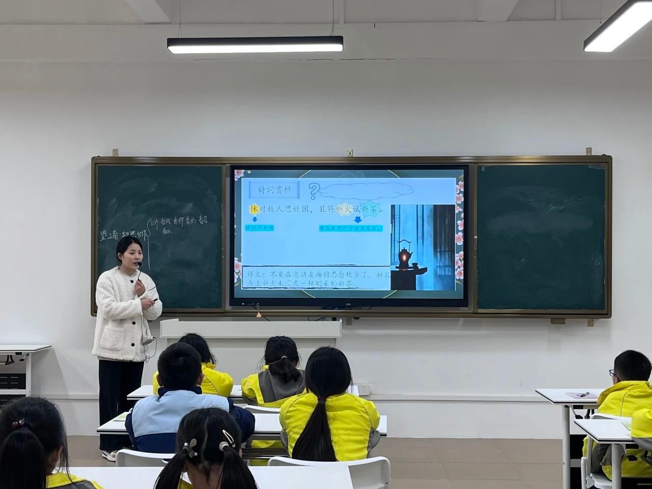 “休对故人思故国,且将新火试新茶。”小梁老师积极地引导同学们理解“新火”“新茶”两个意象,这不仅表示字面意思,更象征着新的生活与开始,表达了词人豁达乐观的人生态度。词作的最后一句——“诗酒趁年华”,在小梁老师的讲解下,同学们感受到了这不仅仅是词人的自我安慰,更是在倡导倡导世人珍惜当下,趁着青春年华,多去做一些有意义的事情。