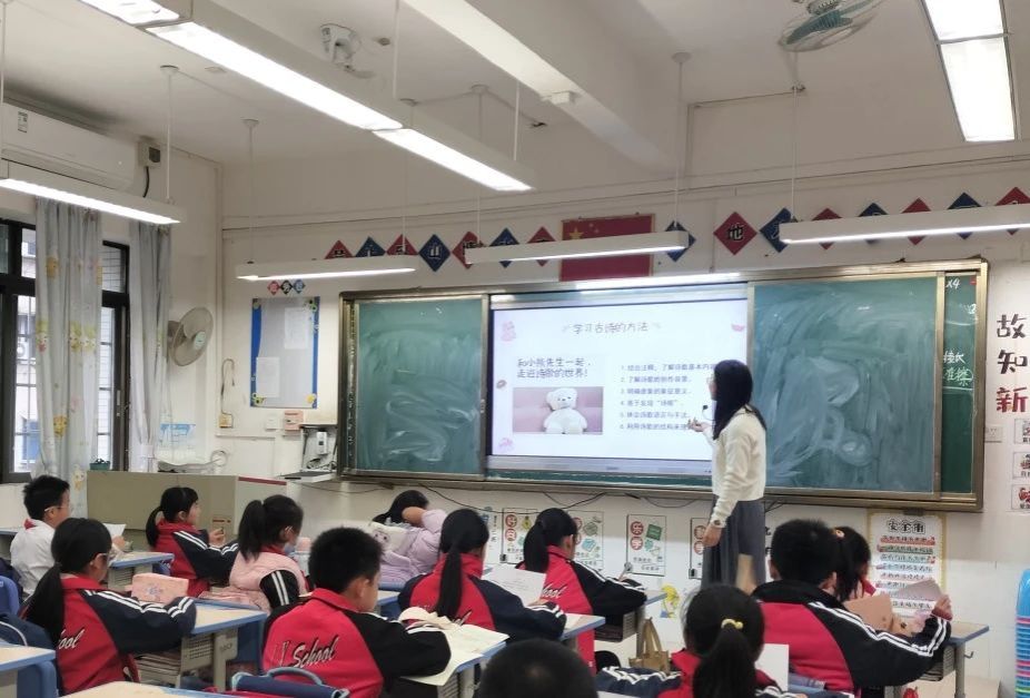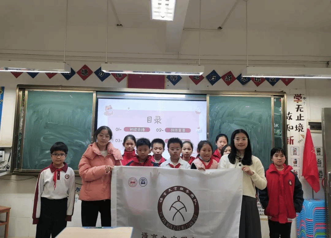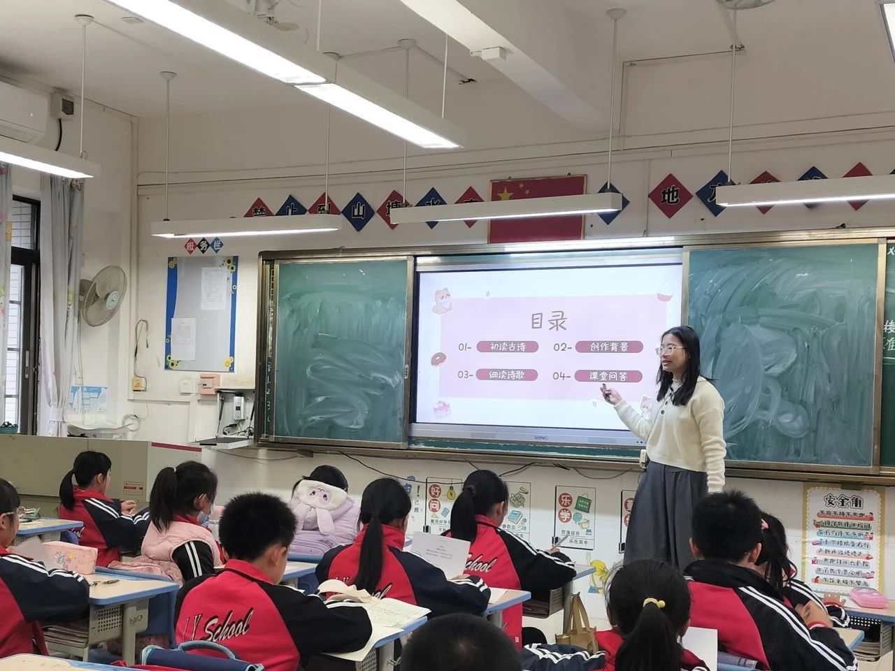 3月31日下午,122cc太阳集成游戏语言文字服务团队的成员们在石巧如指导老师的带领下,来到流溪小学开展本学期的第五次古诗词课堂。本次授课老师是2022级汉语言文学专业的欧贵莹同学,让我们跟着小欧老师一起走进古诗词的世界。