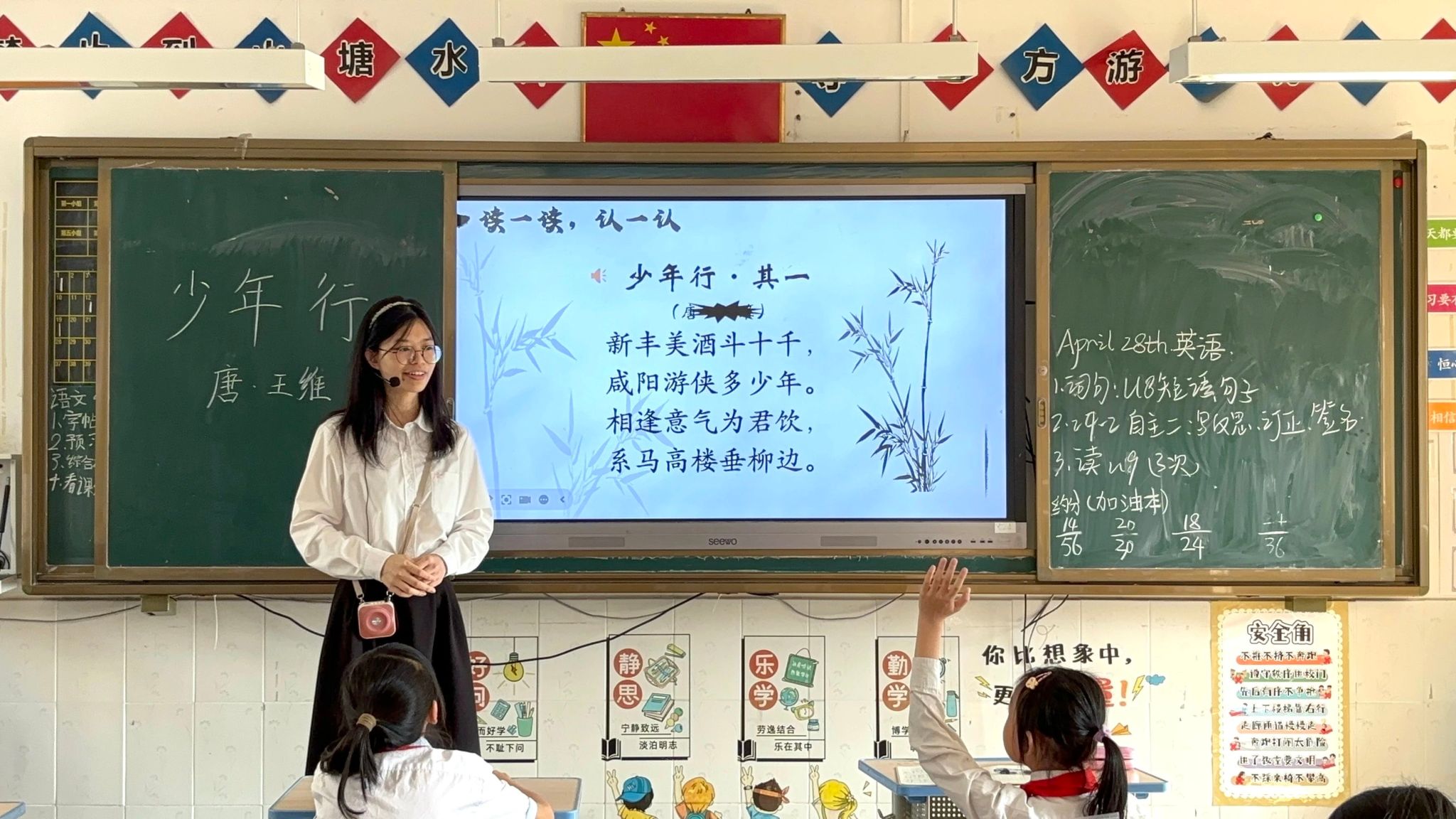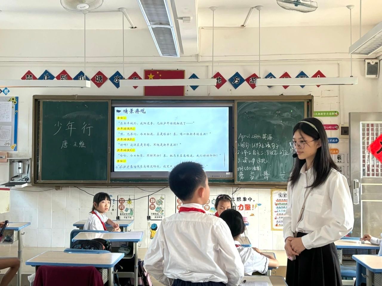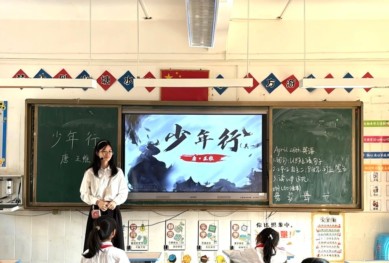 本次授课的成员是来自2022级汉语言文学专业的黎燕婷。小黎老师以王维《少年行・其一》为切入点,在平仄韵律间搭建起古今对话的桥梁,让千年前的游侠少年穿越时空,与课堂上的孩子们展开了一场关于“意气”与“风采”的精彩对话。