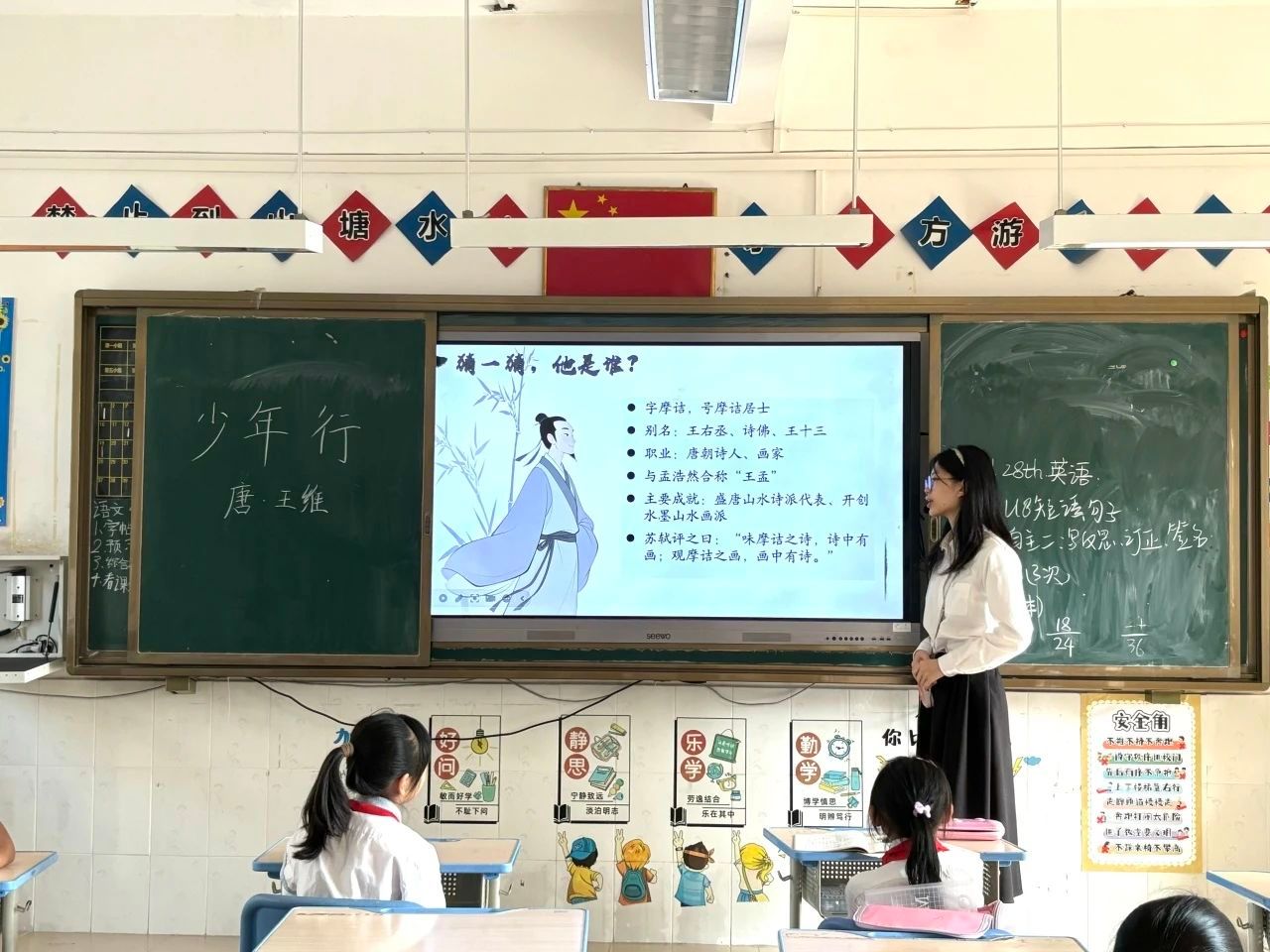 随后,课件上依次展现王维“王右丞”“诗佛”等别名,以及“盛唐山水诗派代表”“开创水墨山水画派”等成就,当讲到他既能写“空山新雨后”的清幽又能著“少年行”的豪迈时,孩子们眼中满是惊叹:“原来大诗人也有一个游侠梦!”