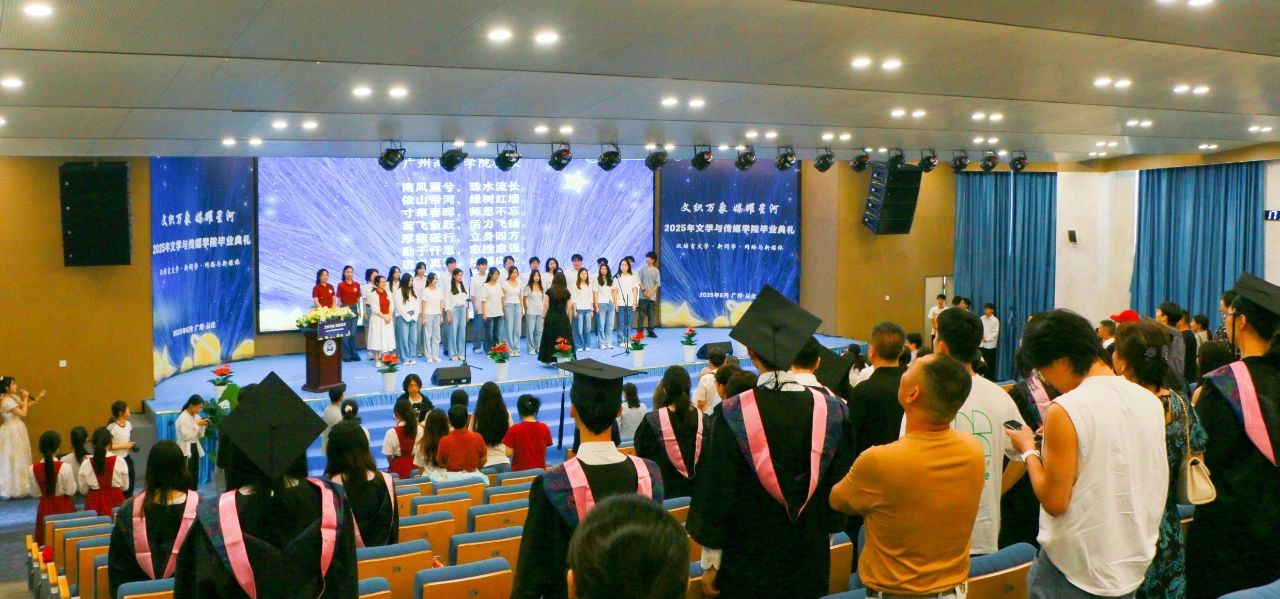 继而,2025届网络与新媒体专业毕业生王艺燊作为毕业生代表发言。初到122cc太阳集成游戏时,从广州火车站的繁华到校园的群山环绕,来自河南的他被南院的山狠狠“震”了一把——这山像困住青春的樊笼,学业上的难题也如同需“爬四年”才能翻越的大山。到大二大三时,他借助自媒体与喜剧破圈,粉丝从20万飙升至百万。这时再看山,不过是“潺潺流水穿过群山”的校园背景,曾经横亘前路的阻碍,早已化作成长的注脚。直到大四奔波实习后重返校园,他忽然懂得:山的存在已不再重要。老师的教诲、同学的陪伴、食堂阿姨的笑脸……这些在山脚下相遇的人,才是大学最珍贵的宝藏。“为天地立心,为生民立命”,他以横渠四句与诸君共勉,愿大家带着校园沉淀的力量奔赴山海。纵使前路“一山放出一山拦”,也请守住读书人的傲骨,做永远发光的南院学子。