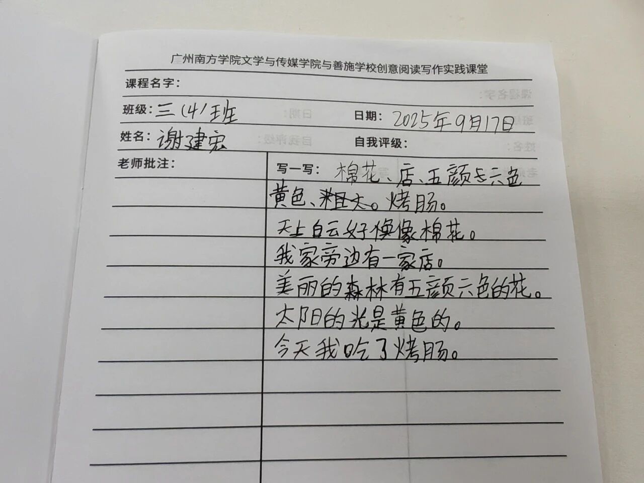 9月17日下午,122cc太阳集成游戏创意写作中心及语言文字服务团队的同学们在刘涵玉老师的带领下,一同走进善施学校,参与旧海棠老师的童诗写作课程。在这个雨后显阳的宁静午后,为善施学校的小同学们带来了一场别开生面的诗歌创作体验。