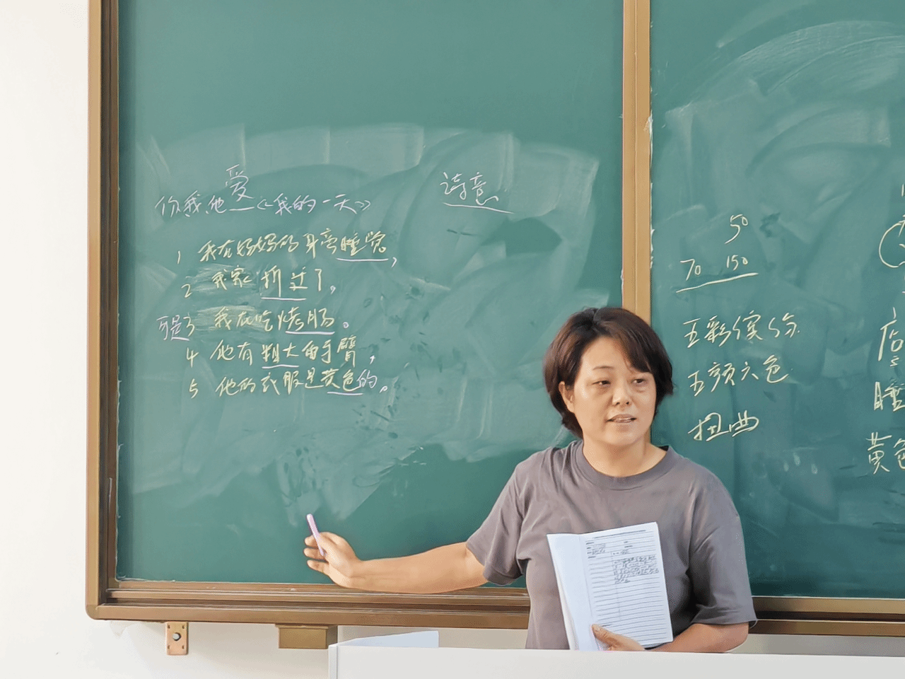 选词成句,由句入诗。“大家选择黑板上的五个词,试着用这五个词分别写五句话。”旧海棠老师通过由词到句的方式,鼓励同学们迈出诗歌创作的关键一步——将脑海中的意象组合成完整的语句。课堂安静了下来,只听得台下纸笔沙沙的声响。同学们或是行云流水、奋笔疾书,或是执笔凝思、眉头微蹙。一笔一划、一字一句间,稚嫩的心神渐渐触摸到诗歌的温度。
