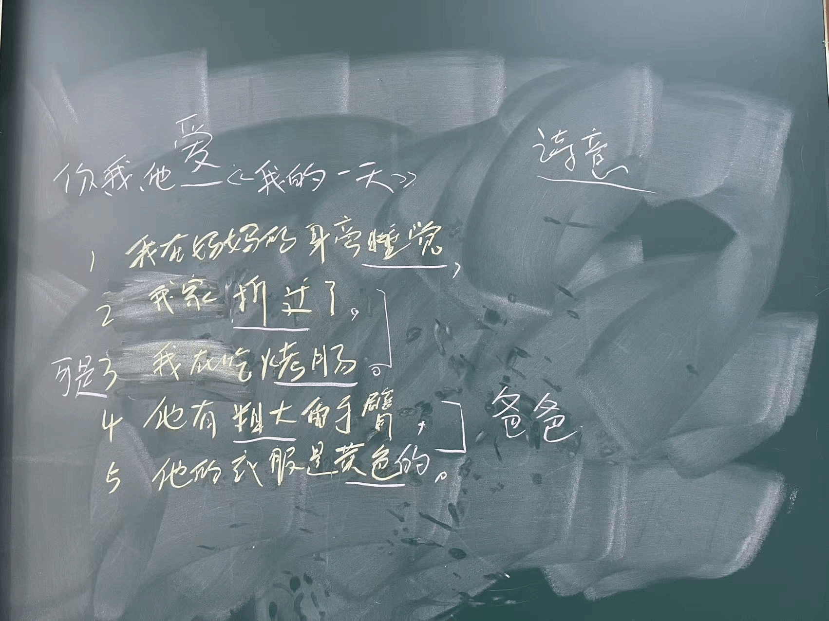时间分秒而过,越来越多的同学停下手中的笔,一首又一首诗篇诞生。旧海棠老师将一位同学的诗歌写在黑板上。并邀请小同学们为这首小诗命名。课堂再次活跃起来,小诗的标题从《爱》,变到《我》,最后又变为《我的一天》,同学们的提议即纯真又符合小诗本身。