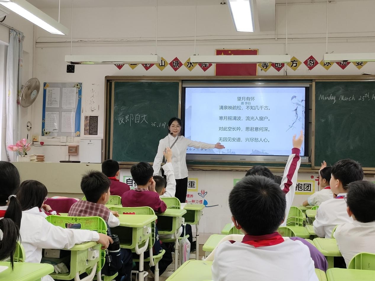 我在流溪小学为学生们讲授了古诗词《闻王昌龄左迁龙标遥有此寄》和《望月有怀》。在这堂课中,通过诗词的韵律和情感来感染学生,使他们在欣赏古诗词的同时,也能感受到诗词背后的深厚文化底蕴。当读到“杨花落尽子规啼,闻道龙标过五溪”时,我引导学生想象那春意阑珊、杜鹃啼血的画面,让课堂沉浸在一种深沉而悠远的氛围中。学生们的积极性超出了我的预期。他们不仅对诗词的内容产生了浓厚的兴趣,还主动分享了自己对诗词的理解和感受。在回答问题的过程中,他们有条不紊,表达清晰,展现出了良好的思考能力和语言表达能力。