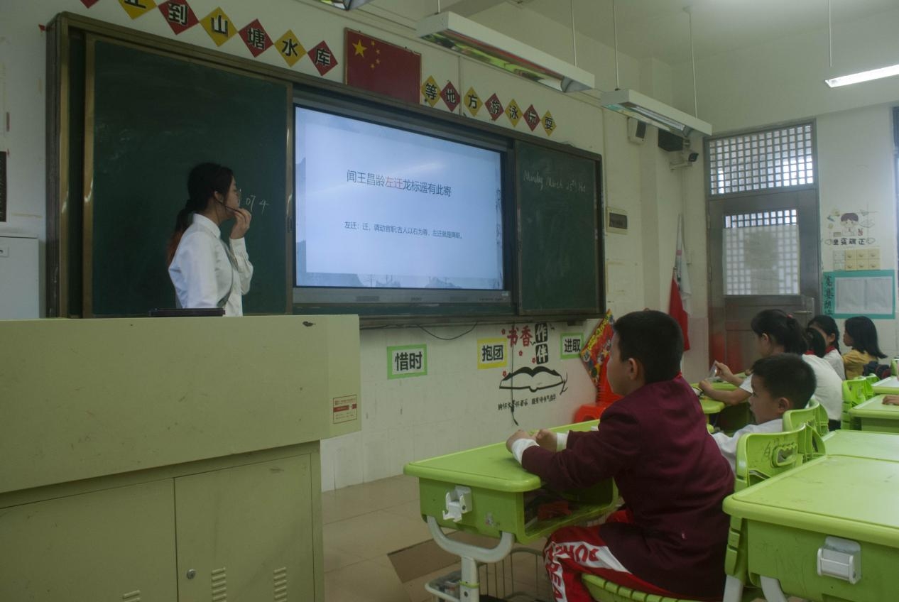 课堂开始,小张老师首先介绍了诗人王昌龄,由此引出诗人李白写的《闻王昌龄左迁龙标遥有此寄》这首诗,小朋友们积极地举手参与课堂互动,并在老师的带领下富有感情地朗诵这首诗。随后老师还带领大家对该诗进行逐句的讲解与赏析,慢慢走进诗人李白的诗境。