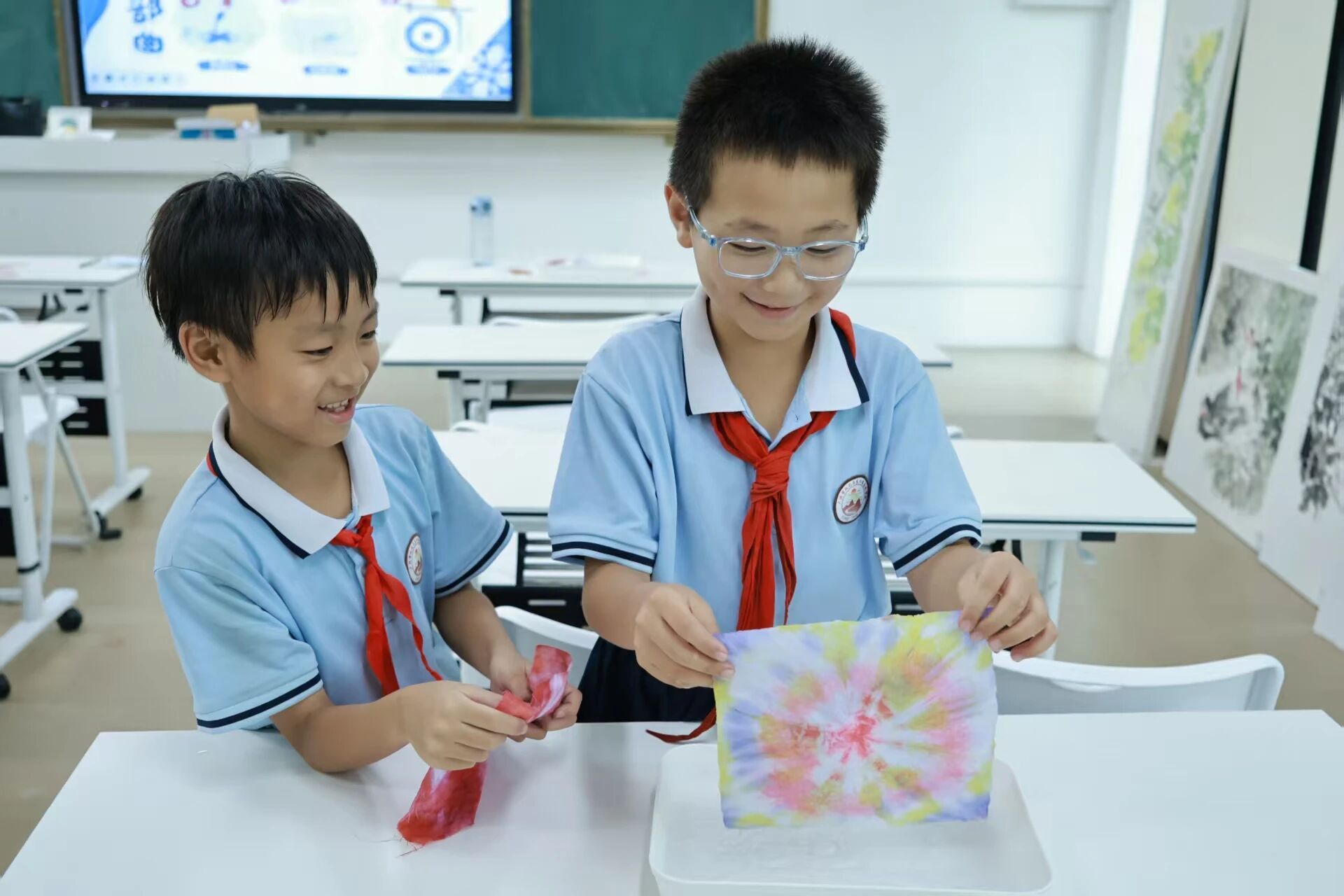 等静置上色后,同学们小心翼翼地解开绳结,眼睛紧紧盯着布面,满心期待地查看属于自己的扎染图案。课堂尾声同学们兴高采烈地展示着自己的作品,一双双小手高举着深浅交织、图案各异的蓝白布条。透过那富有层次的蓝,我们看见了充满童真的创意,更看见了千年非遗从历史中走来,在稚嫩的指尖焕发的勃勃生机。