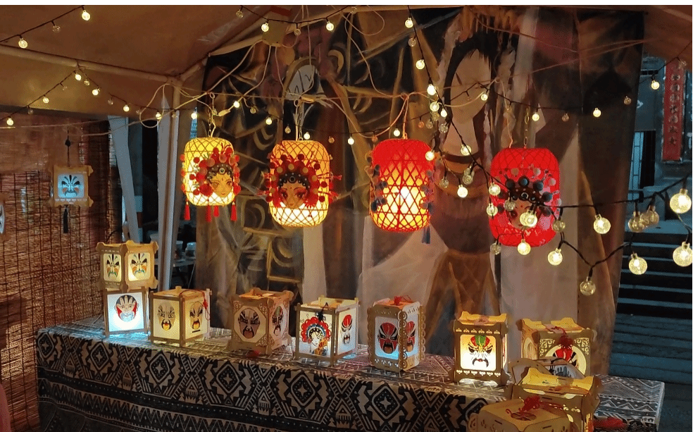非遗脸谱灯摊:竹编骨架撑起绢布灯面,京剧脸谱跃然其上;方块小灯箱中,脸谱纹样错落陈列,灯光透过镂空处洒下,让传统戏曲韵味晕染每一寸布料。