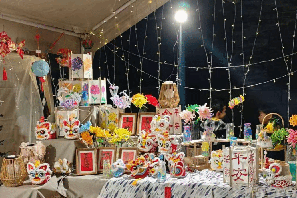 醒狮主题摊:最是热闹鲜活。色彩斑斓的醒狮灯憨态可掬、形态各异;纸艺菊花、祈福灯箱与之相映成趣,把非遗花灯的吉祥寓意与手作温度,揉进市集的烟火气里。