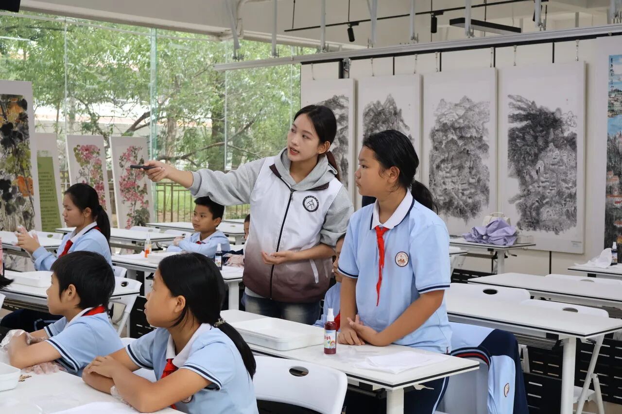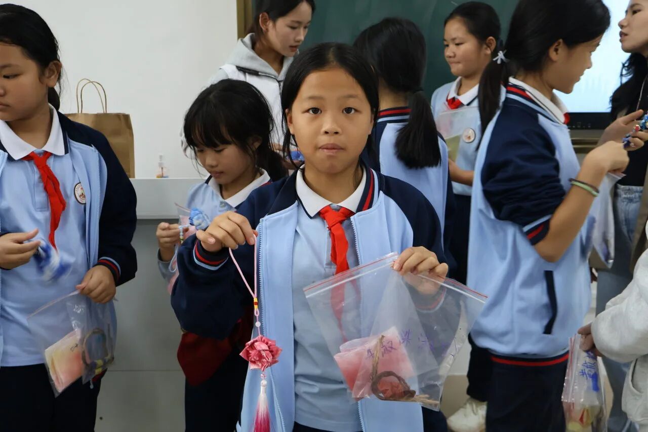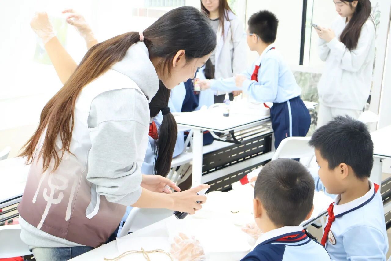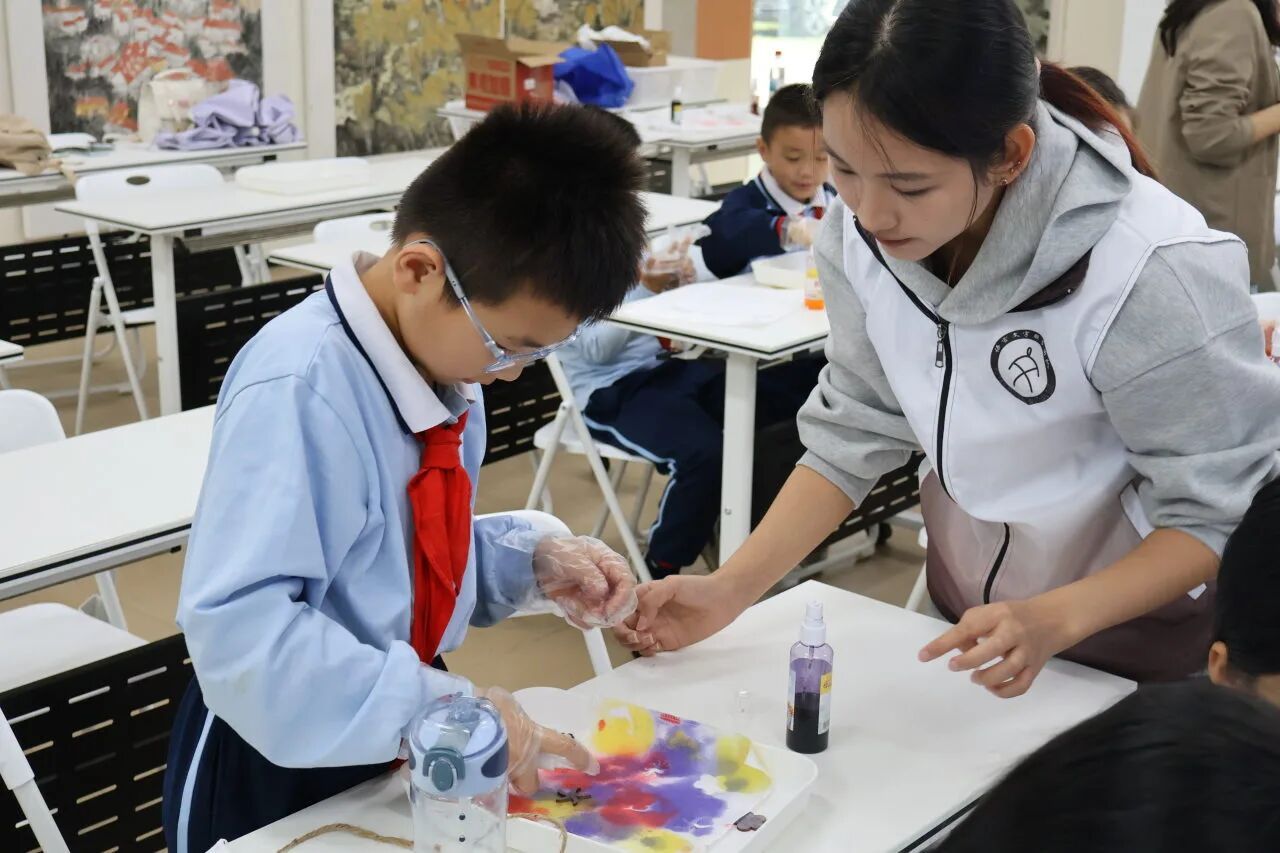 本次课堂的小老师是来自2023级汉语言文学专业的张子盈同学。课堂伊始,小张老师并未急于动手,而是以一段趣味讲解拉近孩子们与扎染之间的距离,一幅幅色彩斑斓、变幻无穷的扎染图案依次呈现,同学们在这场视觉盛宴中,感受着色彩与布料碰撞出的东方韵味。