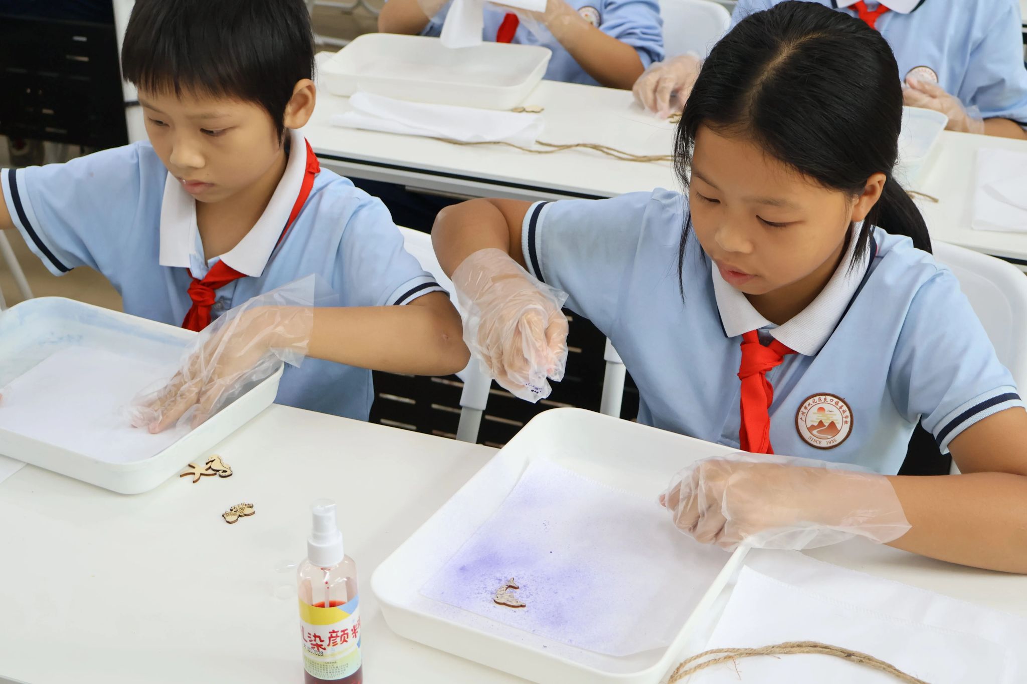 喷染作品初见雏形,课堂的精彩仍在继续。小张老师又将重点转向了此前孩子们好奇的“鱼鳞纹”,专门播放了鱼鳞纹扎染的制作教程。当看到简单的捆扎、折叠,经过浸染后竟能变成形似鱼鳞的精美纹路,孩子们不禁发出阵阵惊叹。一到实践环节同学们纷纷跟着教程耐心地制作着,穿线、捆扎、浸水、染色,稚嫩的双手仔细翻动着布料,眼神专注而认真。小助手们穿梭在座位间,耐心地帮孩子们调整捆绑的力度,教室里充满了温馨的气氛。
