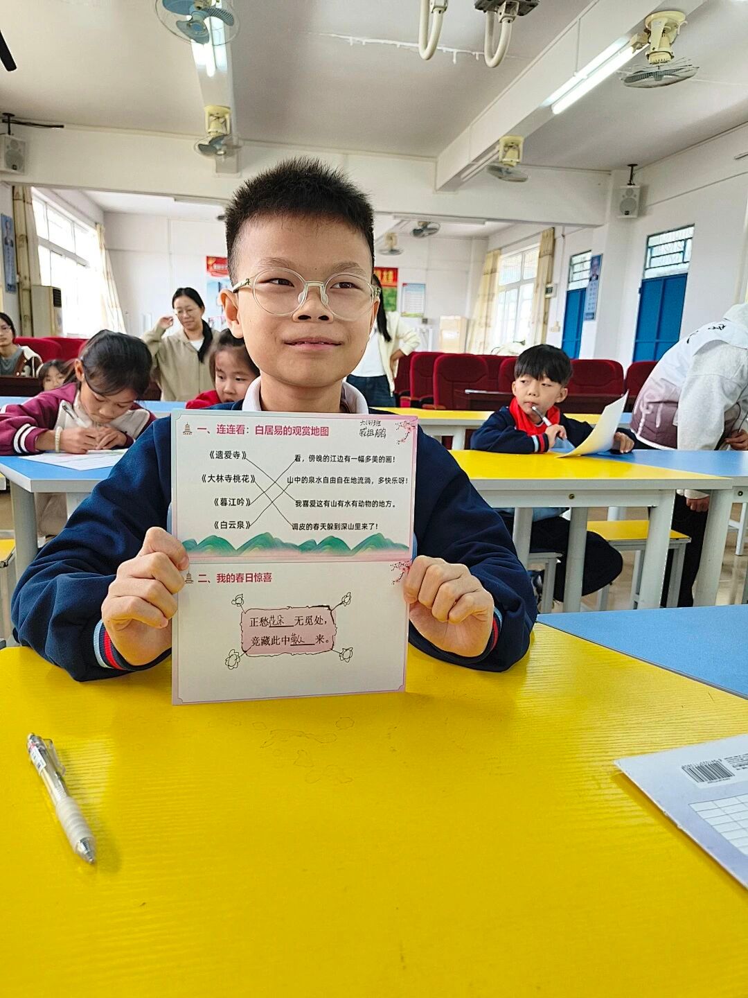 这节课最后的互动环节中,无论是丰富多样的趣味问答,还是绘出“春之希望”的创作活动,都无疑将课堂气氛推向了高潮。在这样轻松愉快的游戏中,同学们完成了今天的学习,一同在秋日里为这次迟来的文学春游谱出终章,而诗中的春色,已悄然浸润了他们对生活的体悟与共鸣。
