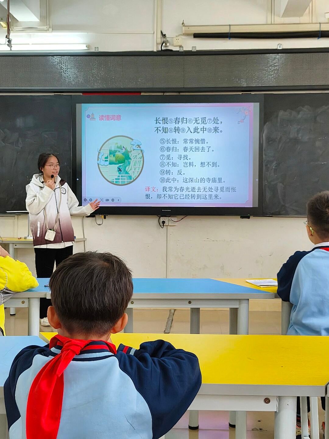 随后,小卢老师讲解了白居易写作的背景,帮助同学们更加深入地理解他“人间四月芳菲尽”的惆怅忧愁与“山寺桃花始盛开”的惊喜。同时,她通过”和春天捉迷藏“这般生动的比喻,将白居易诗中从惆怅到惊喜的情感转变诠释得淋漓尽致,让同学们沉浸其中。